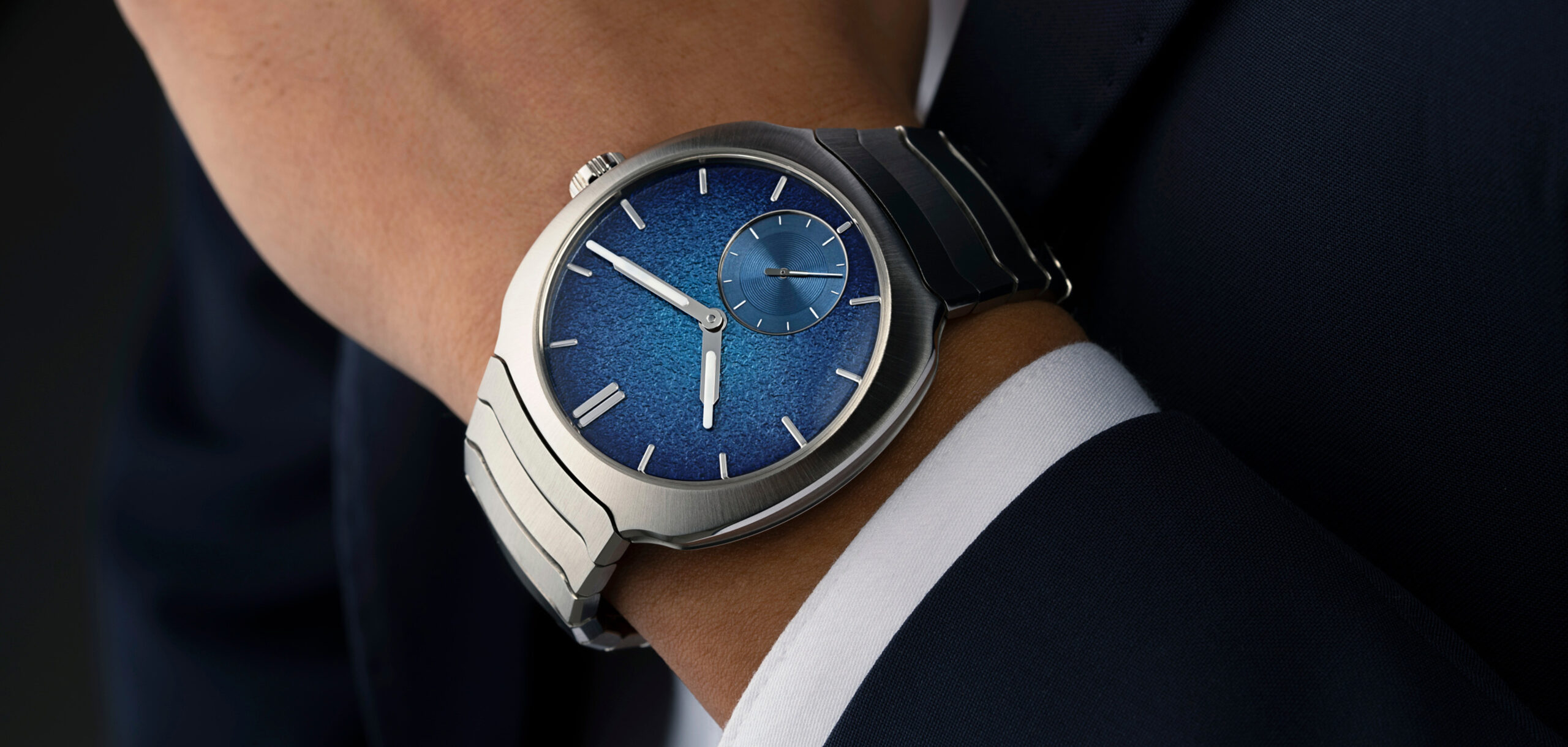 The timepiece joins the Convexe collection, offering a more refined look; featuring a majestic arch bridge and crafted over multiple levels, the openworked titanium piece is available in either black or blue finish.