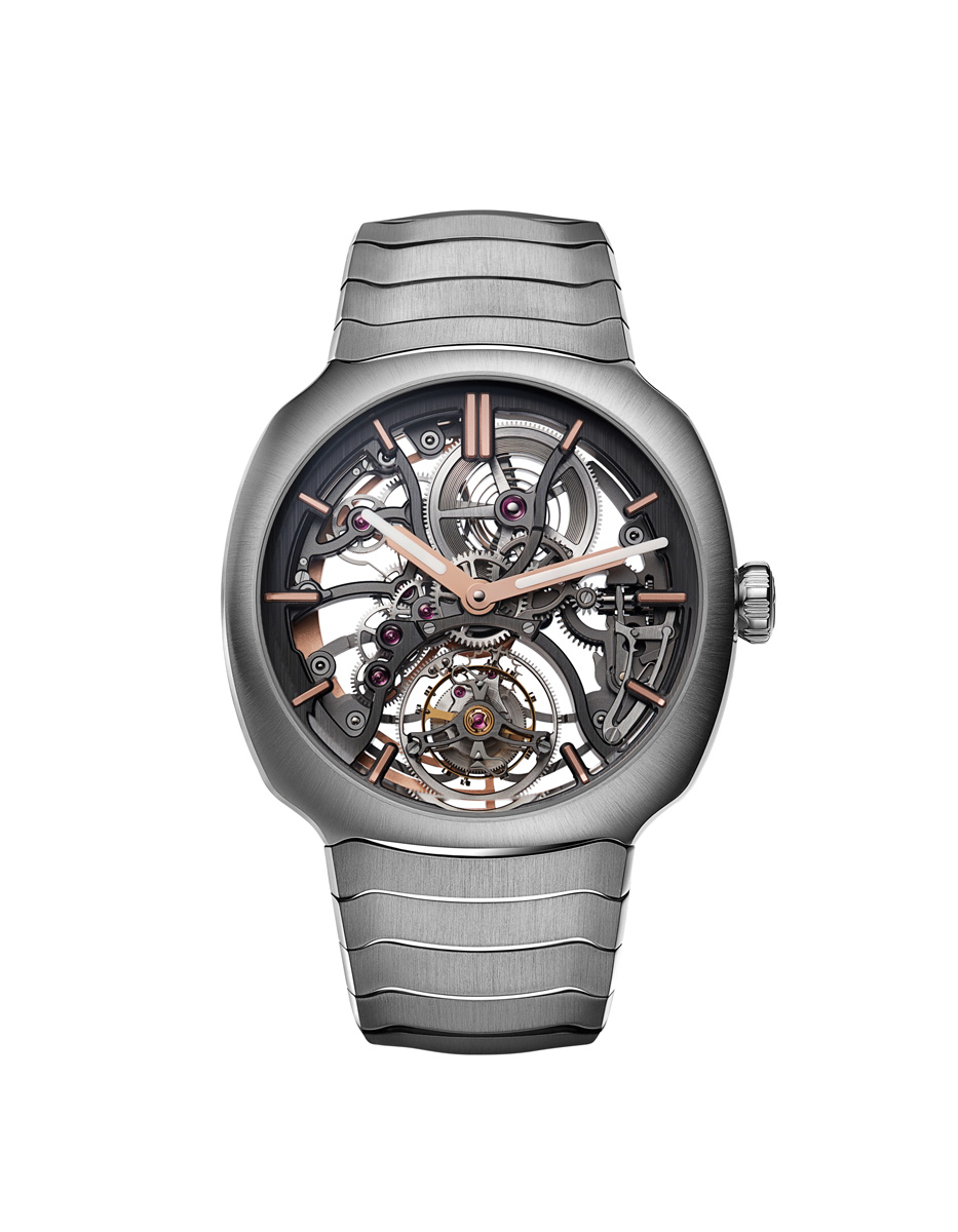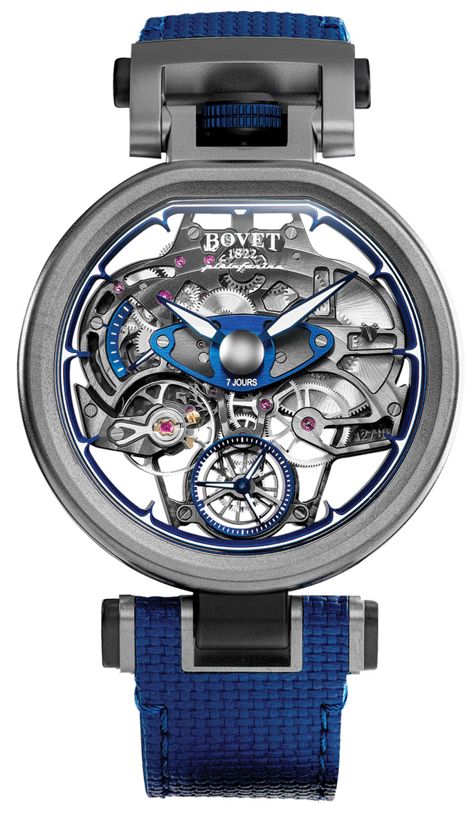 Bovet projects us into the highest league of watchmaking and skeletonisation. The house makes collectible timepieces, using a variety of decorative techniques meant to offer the exceptional calibres a matching exterior. In terms of skeletonisation and calibre display, Bovet boasts elaborate lacework reminiscent of aristocratic splendour, as seen in many Virtuoso and Récital models. While these are the continuators of a noble tradition, the models designed in collaboration with Pininfarina take a different approach, exploiting this tradition in a modern fashion. Thus, the Aperto 1 becomes the epitome of the two companies’ shared passion for “the contemporary and futuristic design translated into exceptional mechanical timepieces”, according to Pascal Raffy, owner of Bovet. The shift in style is remarkable. The Aperto 1 features a manual winding movement and a seven-day power reserve, a 42mm titanium case (the total weight of the timepiece is only 63 grams) and a patented interchangeable strap system, for two available versions distinguished by their colour accents (yellow or blue). The Aperto 1 retails for CHF 48,800 (excluding tax).