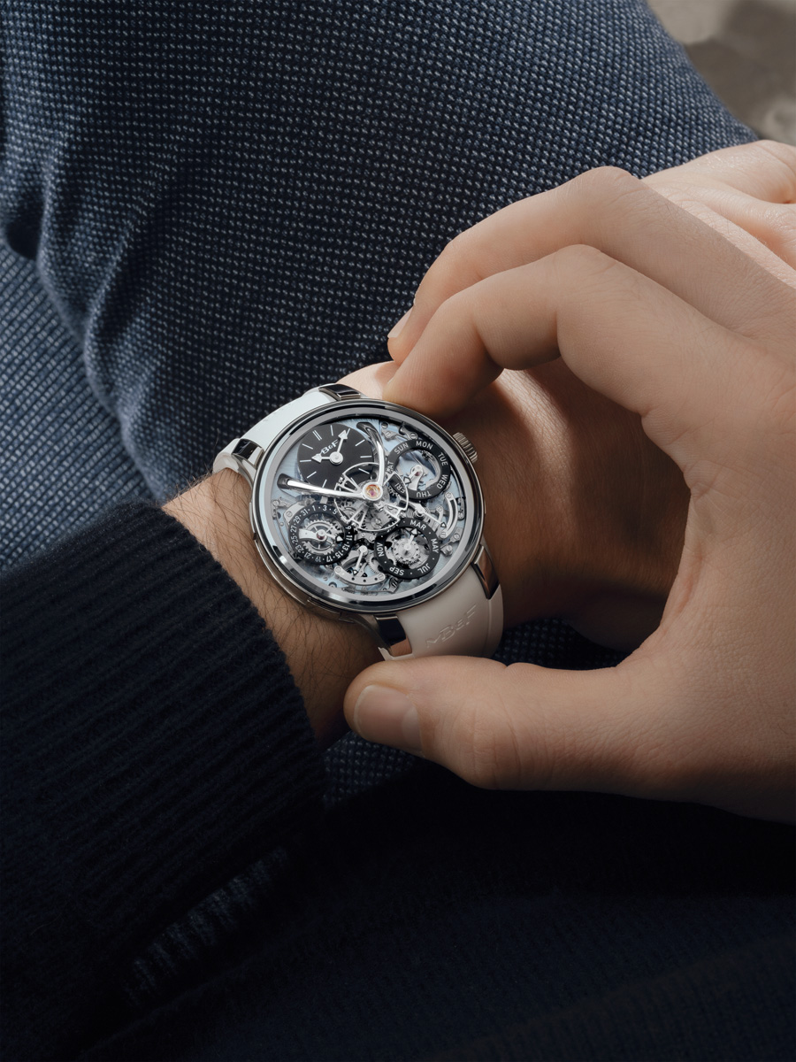 Cyrus’ creations are examples of creativity, authenticity and impeccable craftsmanship. Even some of the major watchmaking houses find it difficult to maintain this balance between innovation and the quality of the finishes. Cyrus is a bold brand (it is not without reason that it has been given this name), assertive, lacking neither the production resources, nor the financial independence to claim a place in the avant-garde niche. At Watches and Wonders they came up with a reinterpretation of Klepcys Réveil (CHF 39,950, excluding tax), a steel timepiece, with a mechanical alarm – a rare complication, and with the Etheral model with two tourbillons, jumping hours and a completely unconventional minute hand. The dial is not exactly skeletonised, but it does contain a wealth of technical information and creates a new choreography of functions. Designed by master watchmaker Jean-François Mojon, the Etheral Twin Orbital Tourbillon has a 44mm rose gold case with titanium inserts, which houses the in-house manual-winding calibre CYR518-E. The first Cyrus model with a round case, this watch is available in a limited edition of 18 pieces, with prices provided on request.