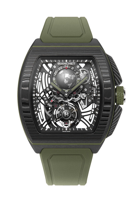 Bianchet is an extremely niche and young brand, which may appeal to some watchmaking enthusiasts who want to stand out by wearing a lesser known (and less accessible) timepiece. The company is deliberately playing this card, with the new Flying Tourbillon Sport GMT (CHF 75,500 + VAT) which is aimed at wealthy globetrotters. With its 3D representation of the Earth, this timepiece reminds of the complex creations of Greubel Forsey, Girard-Perregaux or Arnold & Son, but this single common feature does not compromise the originality of the Bianchet watch. The model allows the time to be read simultaneously in two different time zones and is highly resistant to shocks and pressure. Its technical character resides in the arrangement of the functions, the high quality of the hand-wound movement (with a power reserve of 90 hours) and the presence of a tourbillon. The skeletonisation also plays a key role, as do the materials of the two case versions (51 x 43 x 14.35mm): high-density carbon infused with titanium powder or the same special carbon plus titanium for the caseback and the bezel. The watch is available in six colour versions, each of them accompanied by two rubber straps.