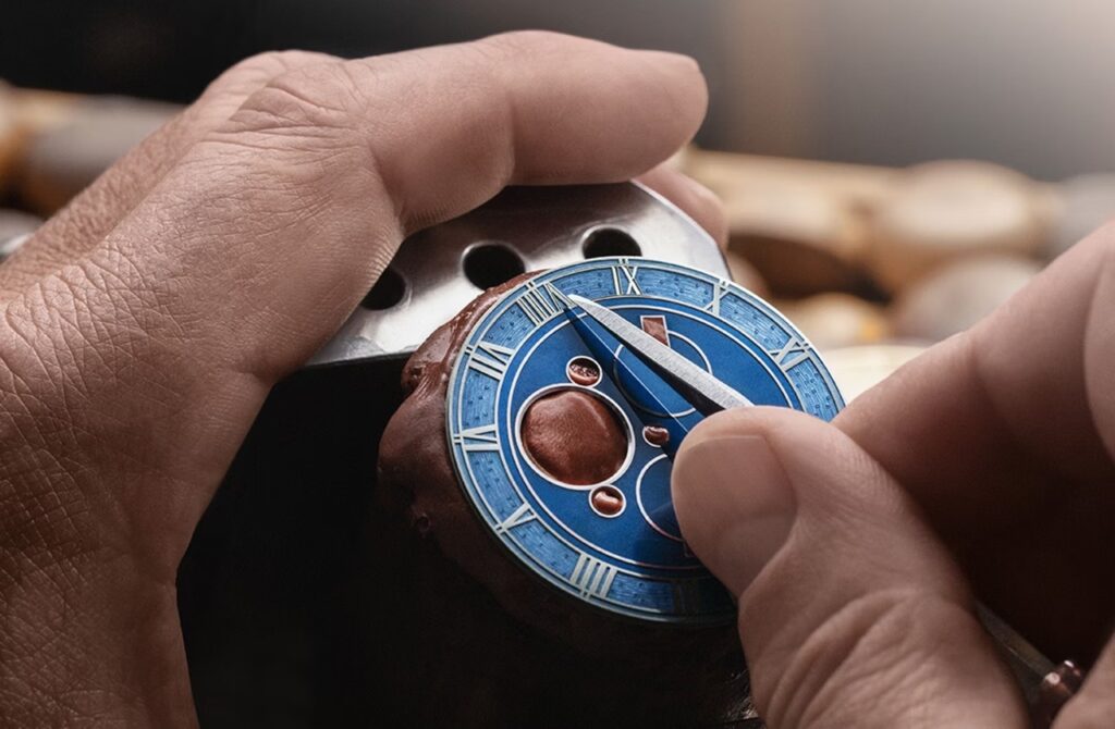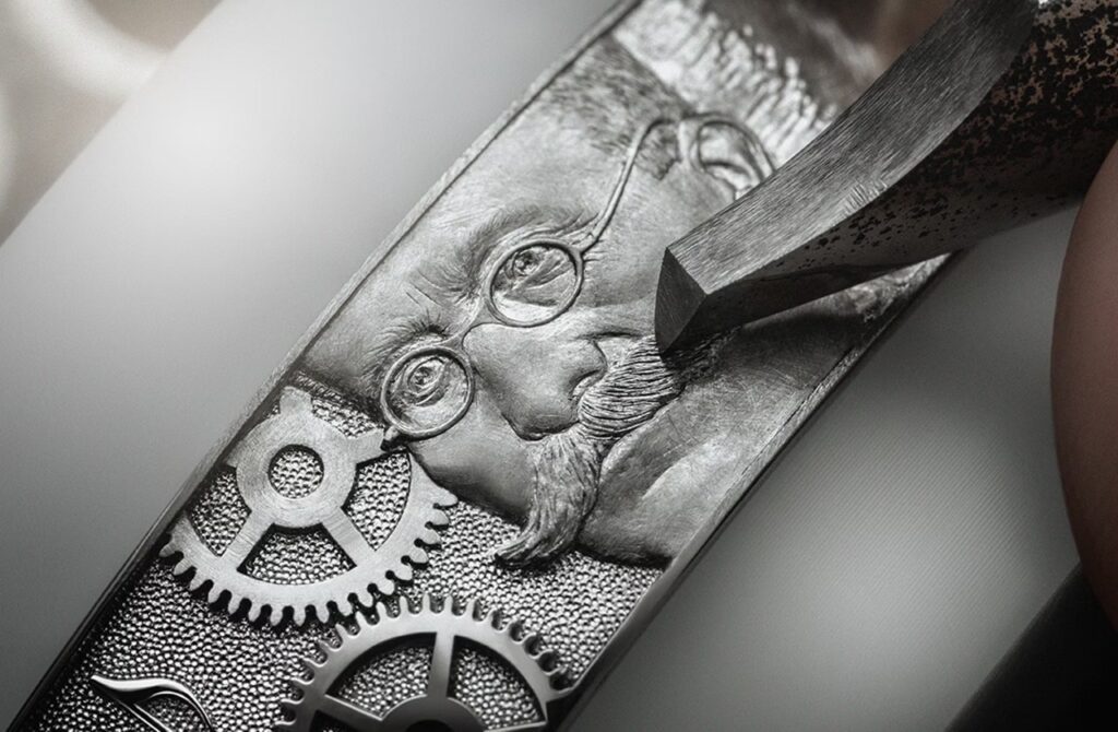 Its presence is immediately striking. The case, sculpted entirely in platinum, measures 50 millimeters in diameter and rises to a thickness of 23.4 millimeters, its surfaces transformed by hand engraving into a tapestry of commemorative motifs. Beneath the glass box sapphire crystal, the dial reveals a depth reminiscent of twilight skies. The translucent blue grand feu enamel shimmers with engraved star trails, while 18‑carat white gold Roman numerals, also engraved by hand, emerge gently from the enamel. The hands, fashioned from 18‑carat pink gold, sweep across tone‑on‑tone counters threaded in silver grey, creating a harmony of color and texture that feels both serene and deliberate.