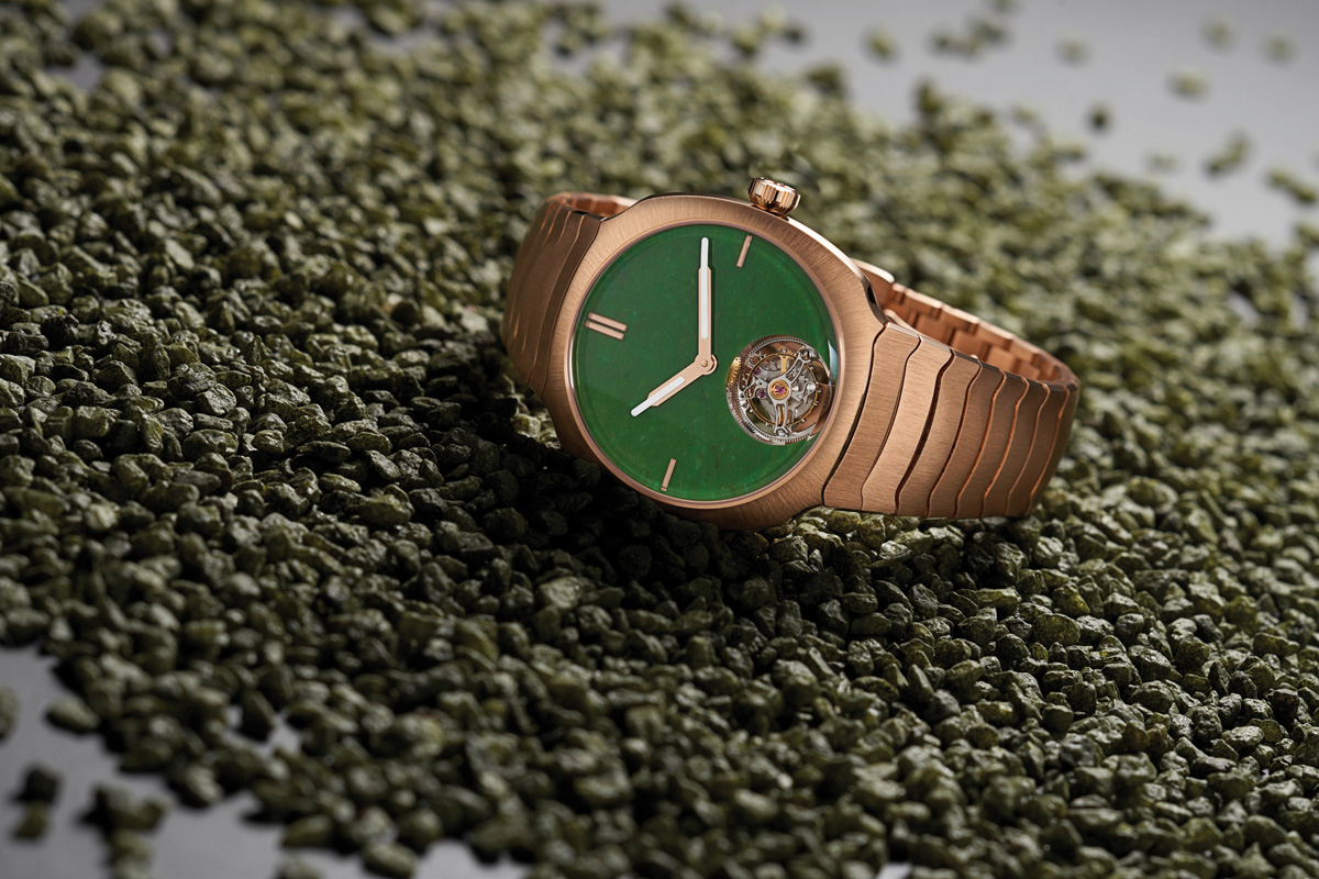 The Schaffhausen Manufacture H. Moser & Cie. made collectors’ pulses race this January with a limited edition of 100 Streamliner Tourbillon Wyoming Jade timepieces, which combine the technical virtuosity of a one-minute flying tourbillon movement with a retro design featuring an olive-green jade dial.