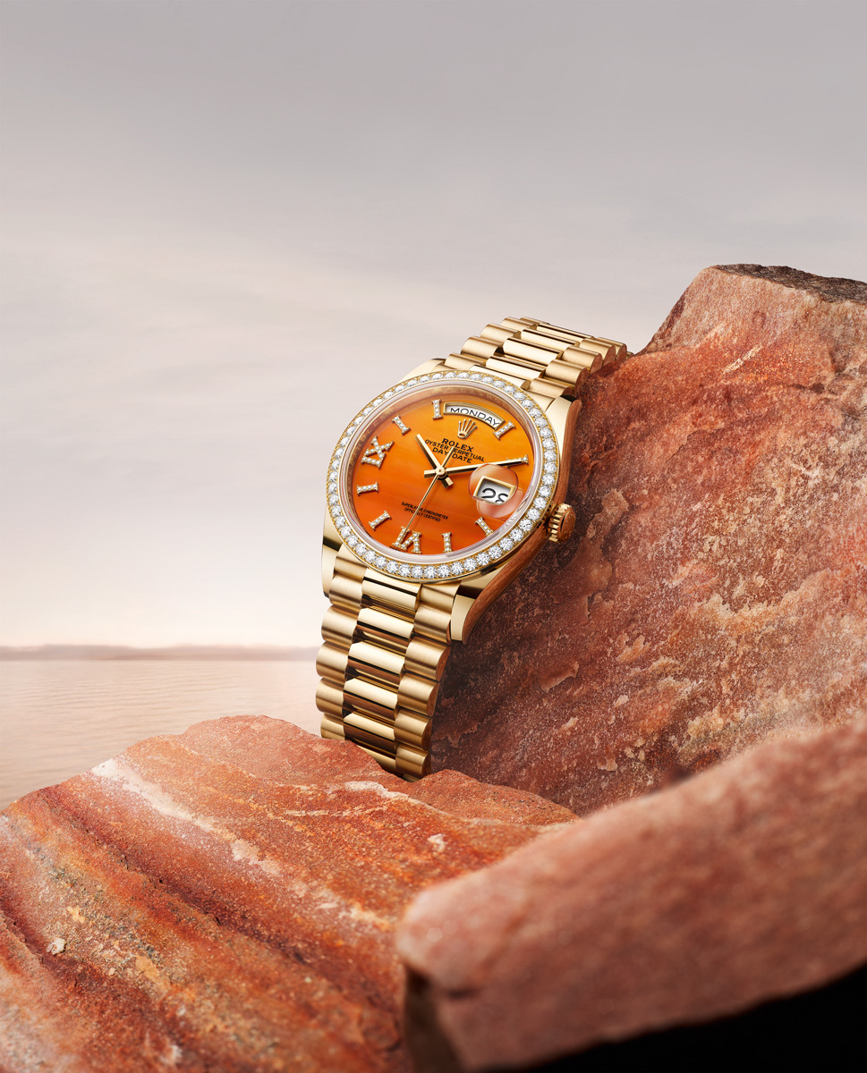 Last year, the brand updated the Day-Date collection, first introduced in 1956 and a favourite of many world politicians and presidents, with three ladies’ Oyster Perpetual Day-Date 36 models whose dials are made of decorative stones that provide a luxurious backdrop for the diamond indexes and diamond Roman numerals VI and IX. The trio of exquisite models with brilliant-cut diamond-set bezels includes a watch in Everose gold with a green aventurine dial, a watch in white gold with a turquoise dial, and a watch in yellow gold with an orange carnelian dial.