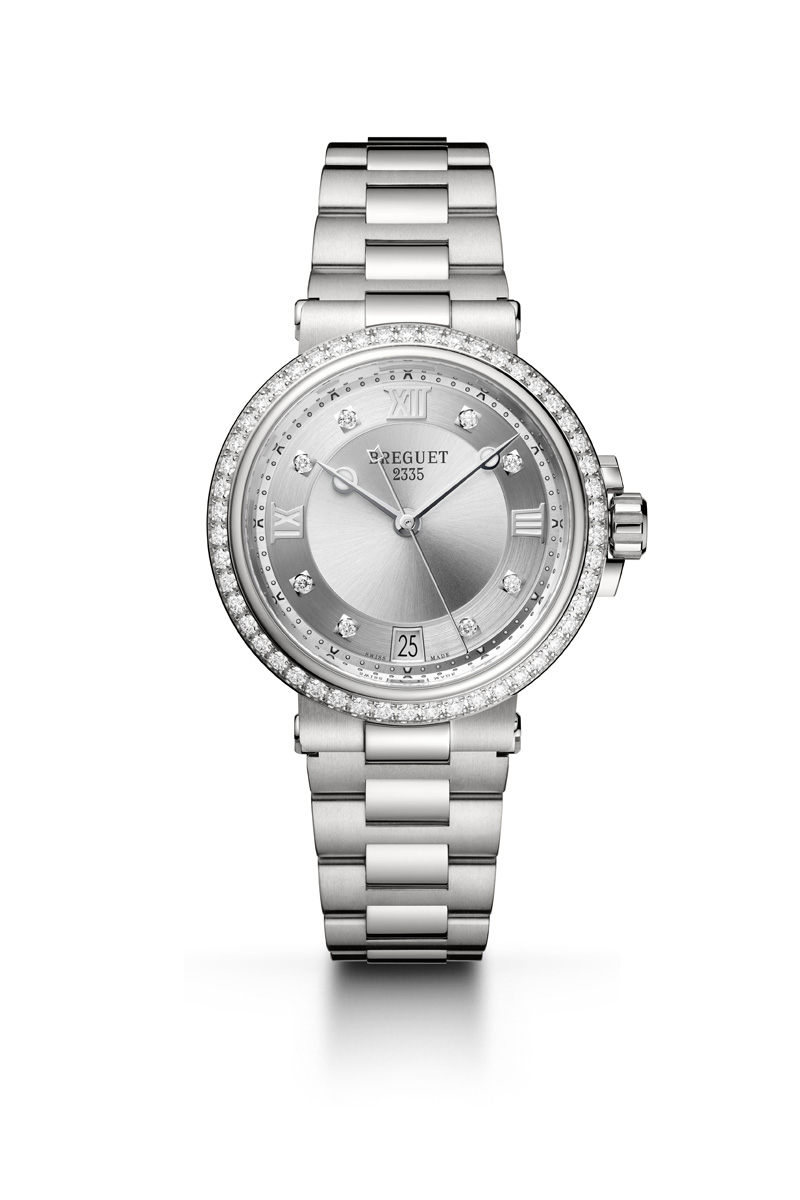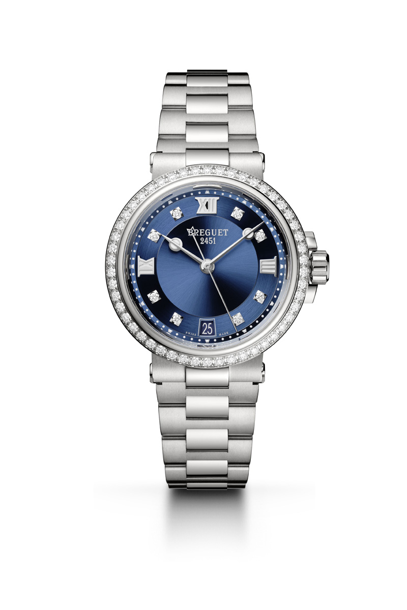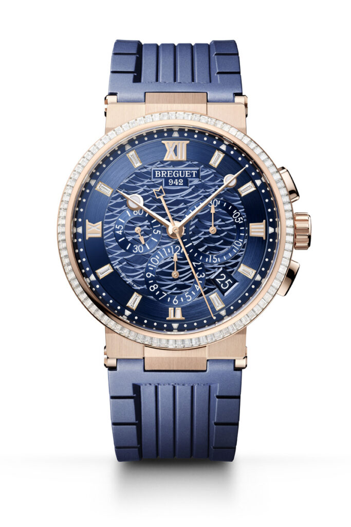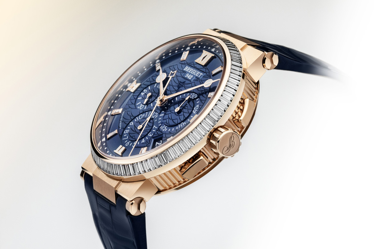 As if to evoke sunshine sparkling on water, eight diamonds take the place of certain hour-markers on each dial, while the bezel is decked out with 50 diamonds. This model features several of Breguet’s notable aesthetic attributes.