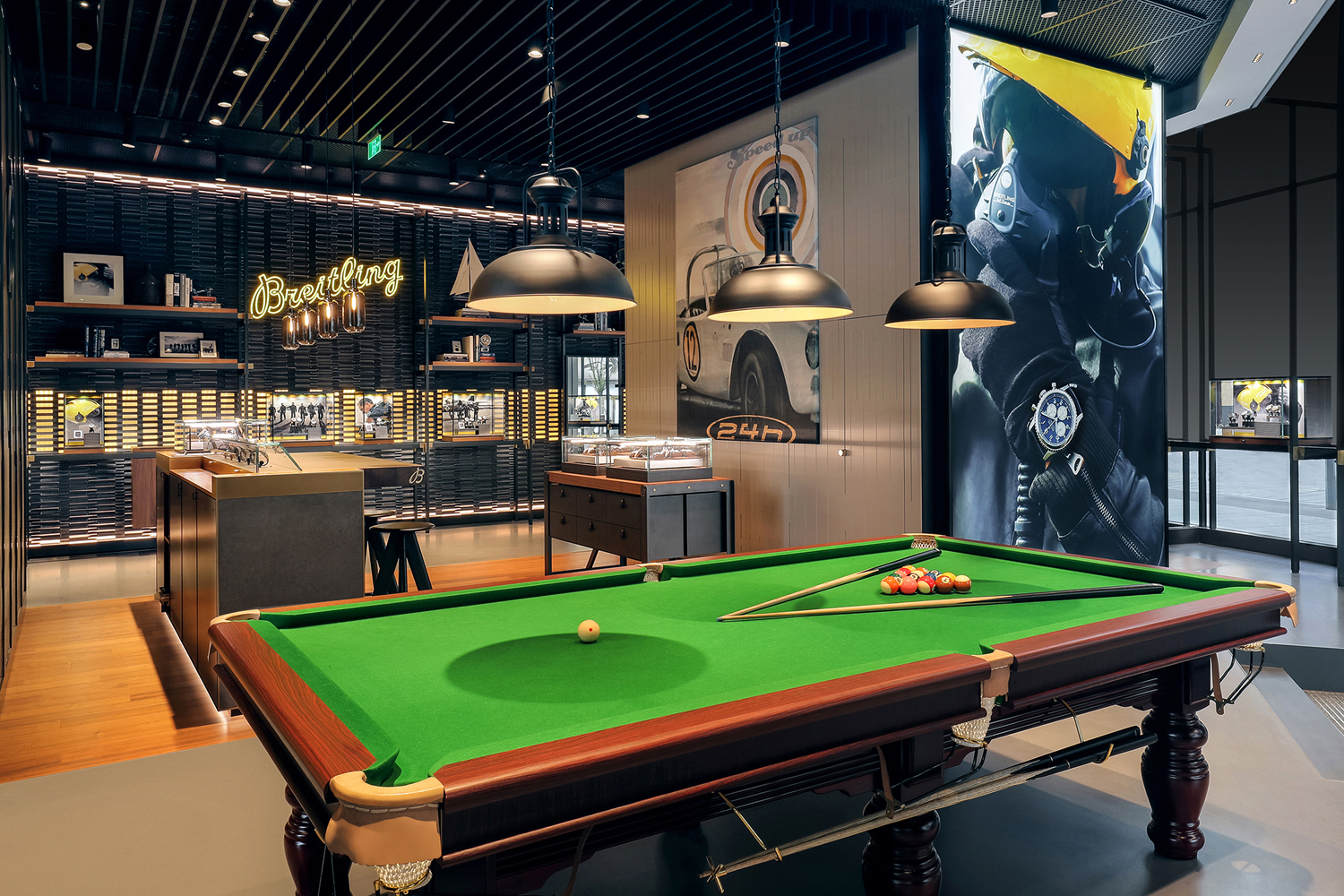 The creative, trendy entrance bar is a masterpiece in its own right. It offers an attractive display of the watches and serves to present Breitling’s products to its visitors, who can also play a game or two on the professional pool table.