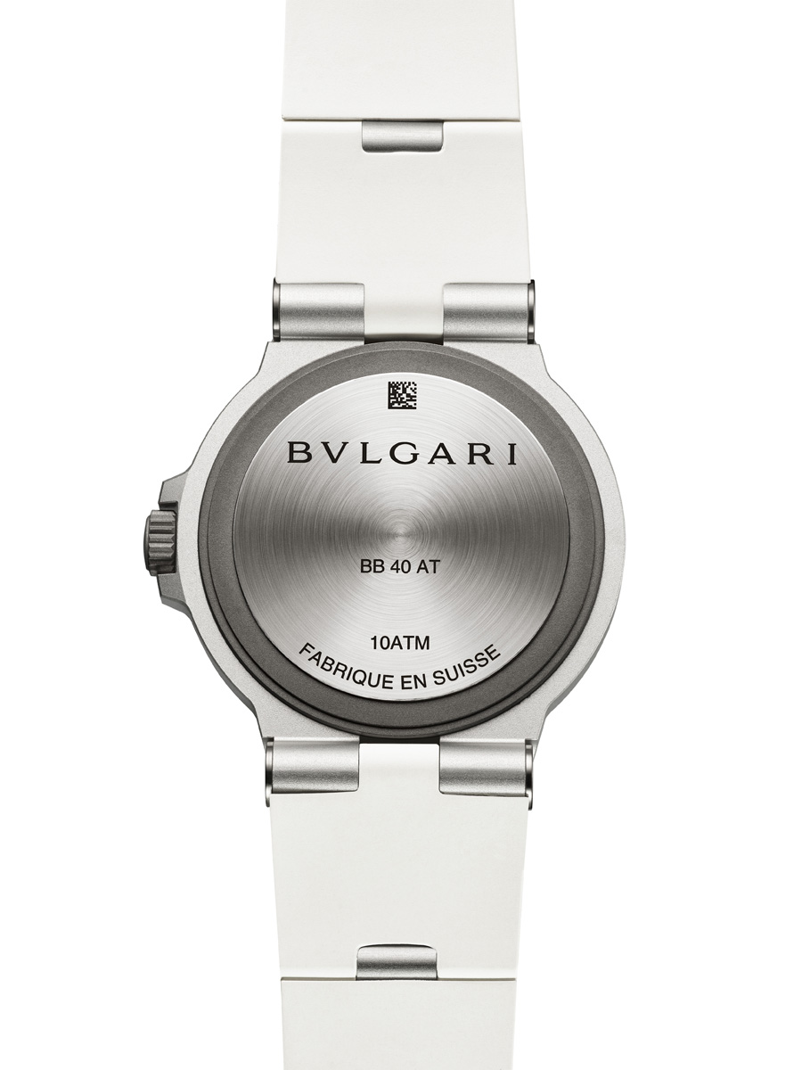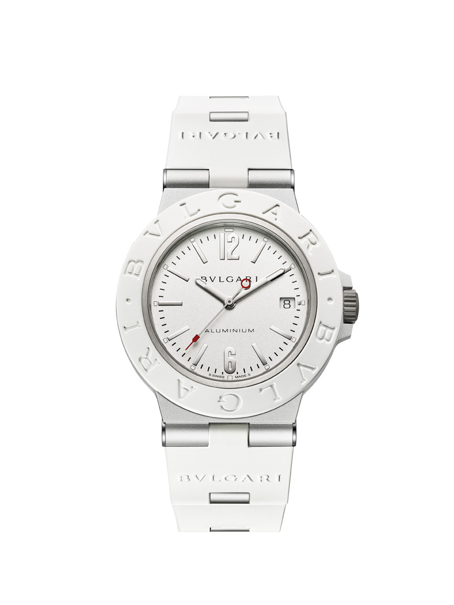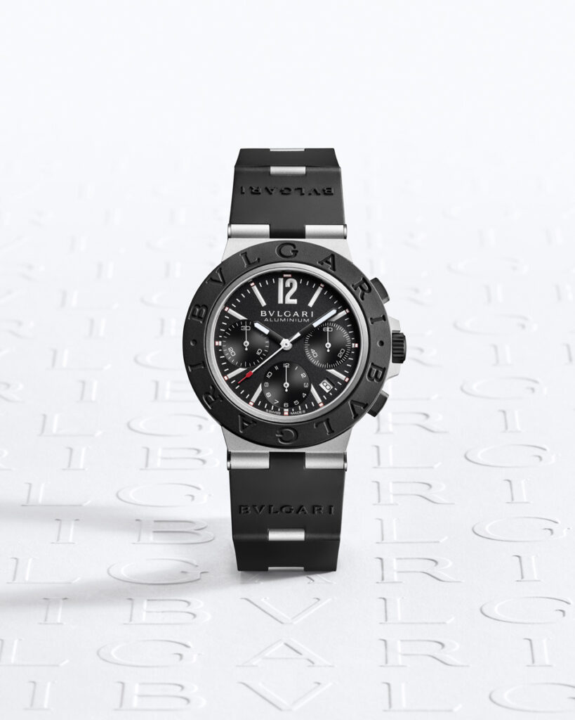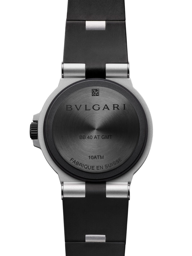 The Bvlgari Aluminium Black GMT, returns to its original, powerful visual identity: a white dial set against the black bezel and rubber strap. The GMT function is color-coded with red for ‘day’ hours and black for ‘night’ hours, ensuring intuitive time-reading. The secondary hour hand is distinguished by a white arrow trimmed in red. In low light, the hands and markers, coated with Super-LumiNova®, provide outstanding visibility. The user-friendly design of the Bvlgari Aluminium Black GMT makes setting local time and any chosen time zone simple, using just the crown. Moreover, the date display is subtly positioned at 3 o’clock. This latest interpretation of the Bvlgari Aluminium GMT reveals the exquisite aesthetic sense that appeals to the most sophisticated globetrotters.