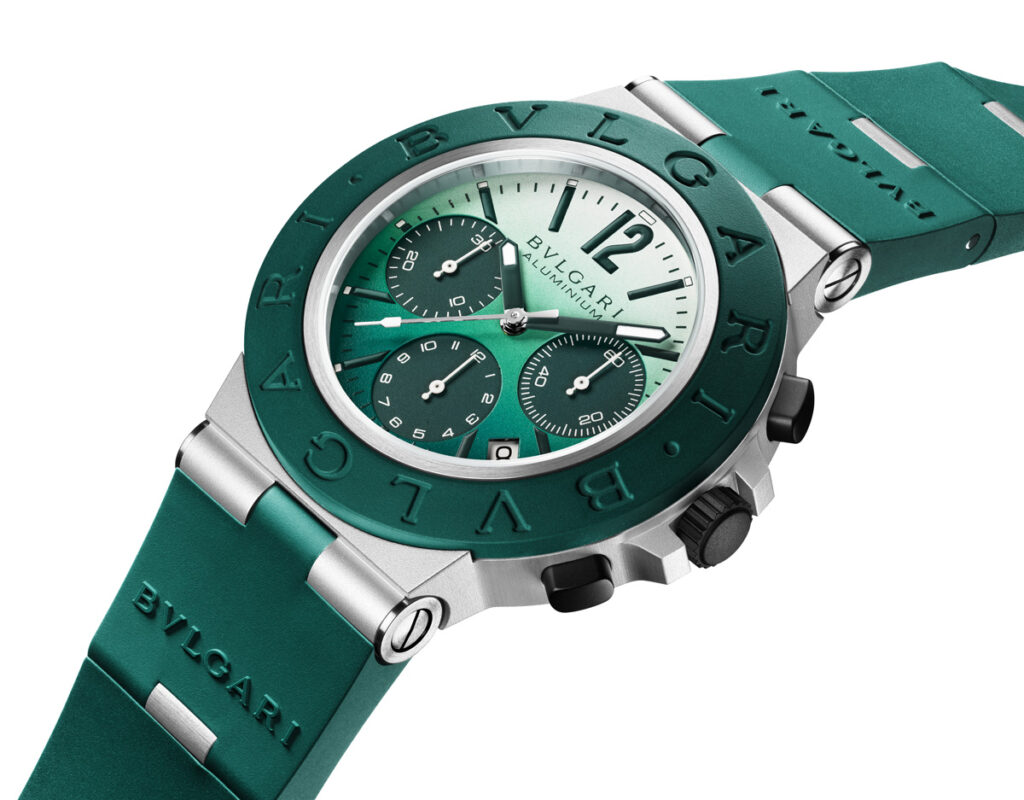 The Bvlgari Aluminium Chronograph Smeraldo extends the Italian seaside holiday narrative, inviting a metaphorical plunge into the Sardinian blue. This limited-edition of 1000 pieces is distinguished by its remarkable dial, graduating from white to turquoise green. Matched with a deep green rubber for the bezel and strap, articulated with aluminum links, the watch exudes a sense of playfulness and sophistication. The dial, with green chronograph counters, dark green hands, and a date window at 4:30, ushers in summer with vibrancy and elegance.