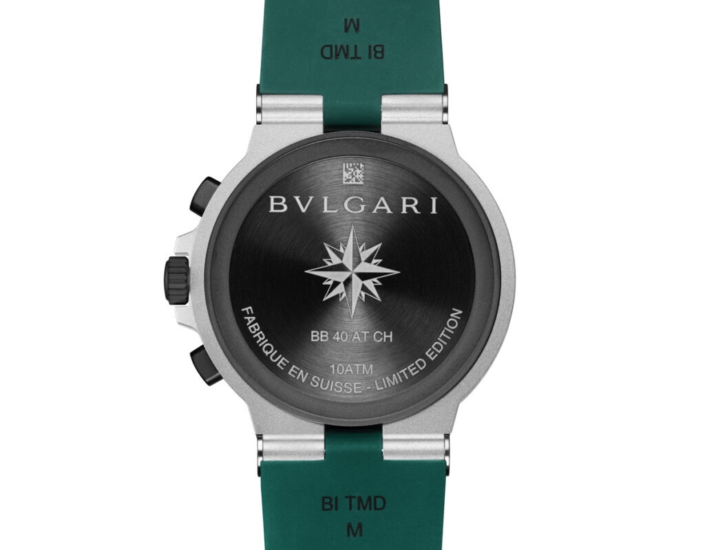 Pulsating at the heart of the Bvlgari Aluminium Chronograph Smeraldo is the automatic B130 mechanical movement, featuring chronograph and date functions. With its intuitive start/stop and reset pushers, timing precision is at the wearer’s command. The titanium caseback sports an intricate Rosa dei venti engraving. Encapsulating the essence of an Italian summer, this exclusive model is encased in a box that echoes the sea’s shimmering green tones.