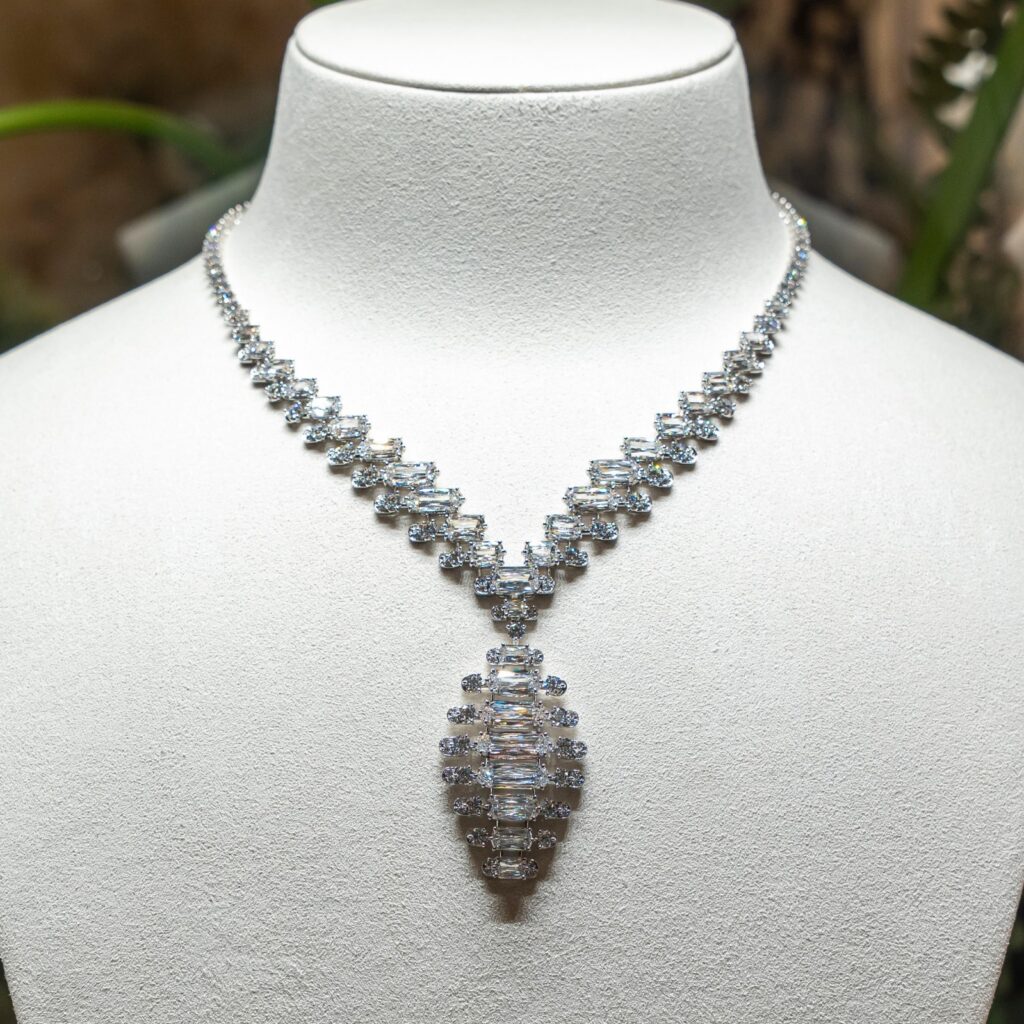 The necklace’s structure plays with alternating rhythms: openwork passages, geometric intervals, and a choreography of square, baguette, and brilliant cuts. Even the clasp participates in this dance, gliding along twin strands to adjust the drape with effortless precision. EUPHONIA pulses with a quiet vitality, as though the stones themselves were keeping time.