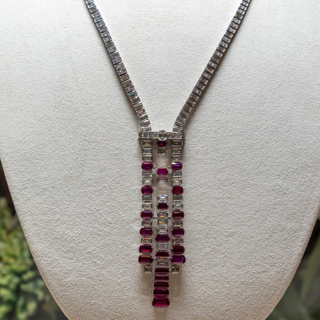 Among the collection’s most striking creations, the EUPHONIA necklace embodies Cartier’s fascination with unexpected pairings. Here, rubies and diamonds—sourced in two distinct, perfectly matched batches—are united through the disciplined geometry of the emerald cut. The result is a composition that feels both architectural and musical.