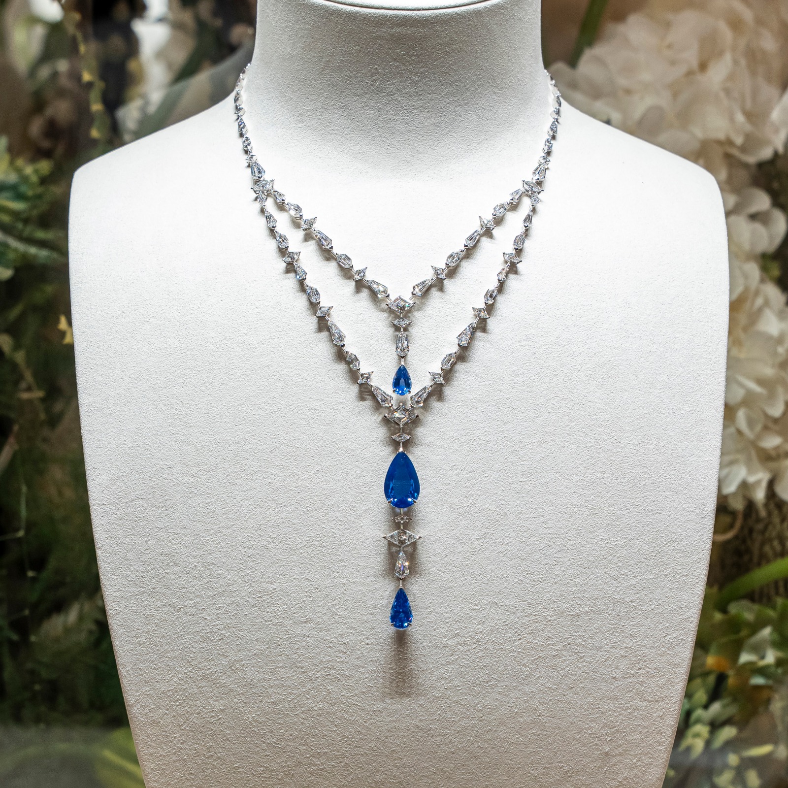These sapphires rest upon strands of diamonds cut in kite, brilliant, and classic shapes—each chosen to introduce subtle shifts in rhythm and structure. The result is a piece that feels serene yet commanding, a perfect equilibrium between restraint and splendour.