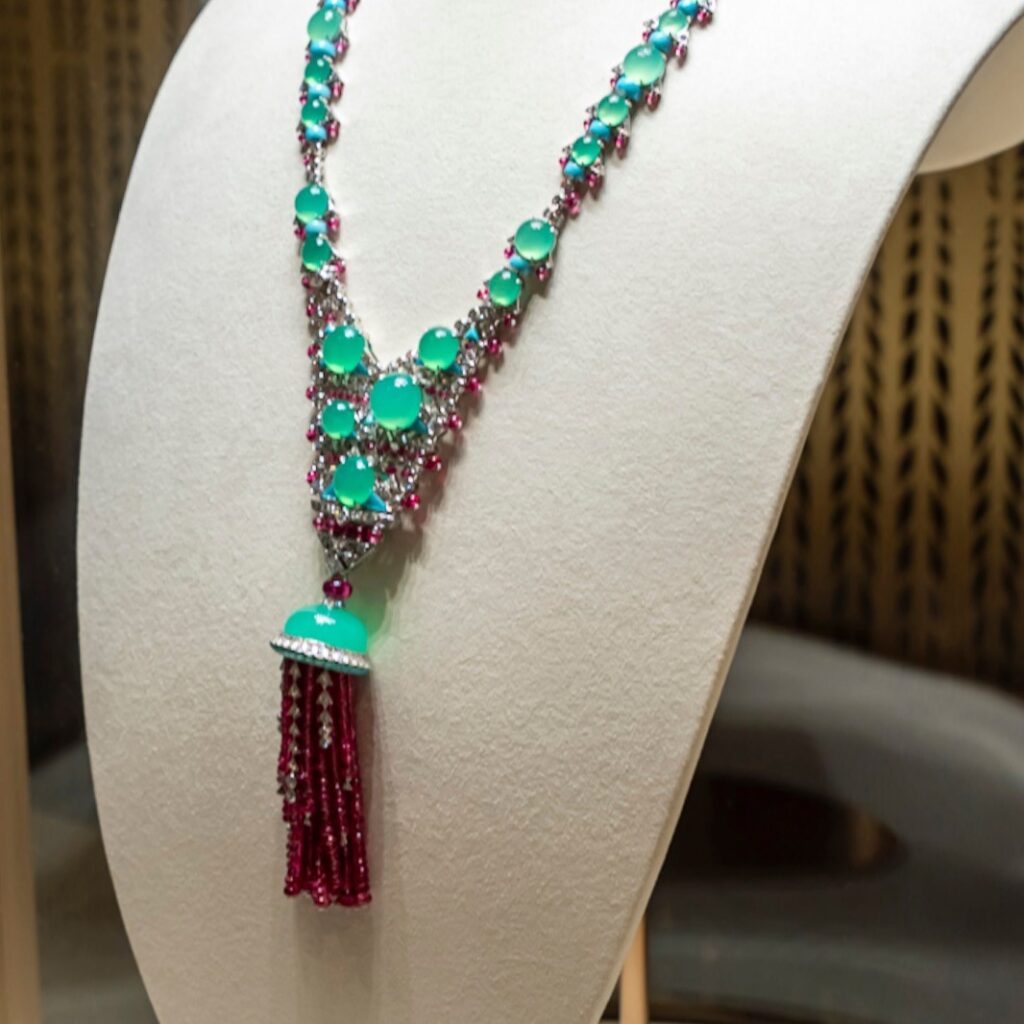 With ONDORA, Cartier revisits one of its most iconic colour palettes, blending chrysoprase, spinels, turquoise, and diamonds into a composition that feels both contemporary and timeless. The maison has long embraced the tension between organic softness and geometric precision, and this necklace brings that dialogue to life.