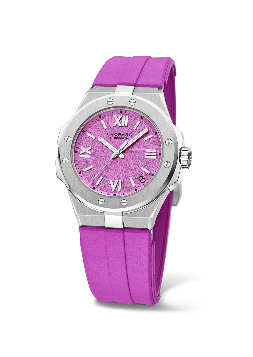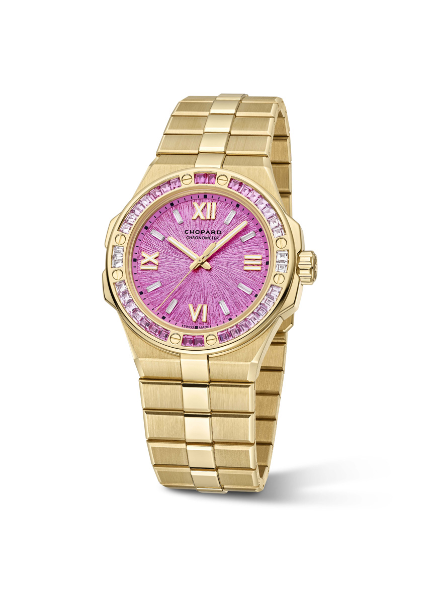 For V-day, the Alpine Eagle Summit line expands with a refined 36 mm creation distinguished by its luminous “Rock Jasmine” dial and a bezel adorned with baguette-cut pink sapphires arranged in a delicate gradient. Crafted in 18-carat ethical yellow gold, this radiant timepiece is powered by the Chopard 09.01‑C movement, whose accuracy is validated by official Chronometer certification. Now introduced in the 36 mm Summit model, the “Rock Jasmine” shade joins the collection’s signature colours—Aletsch Blue, Bernina Grey and Pitch Black—each drawn from the natural tones of the Alpine landscape. This soft pink hue pays homage to the Androsace alpina, a rare mountain flower that thrives only at high altitudes. The dial’s textured brass surface enhances its depth, while cardinal markers and hands treated with Super‑LumiNova® Grade X1 ensure clarity in any light. Additional hour markers sparkle with baguette-cut diamonds, echoing the brilliance of the gem-set bezel.