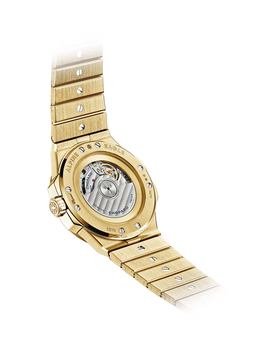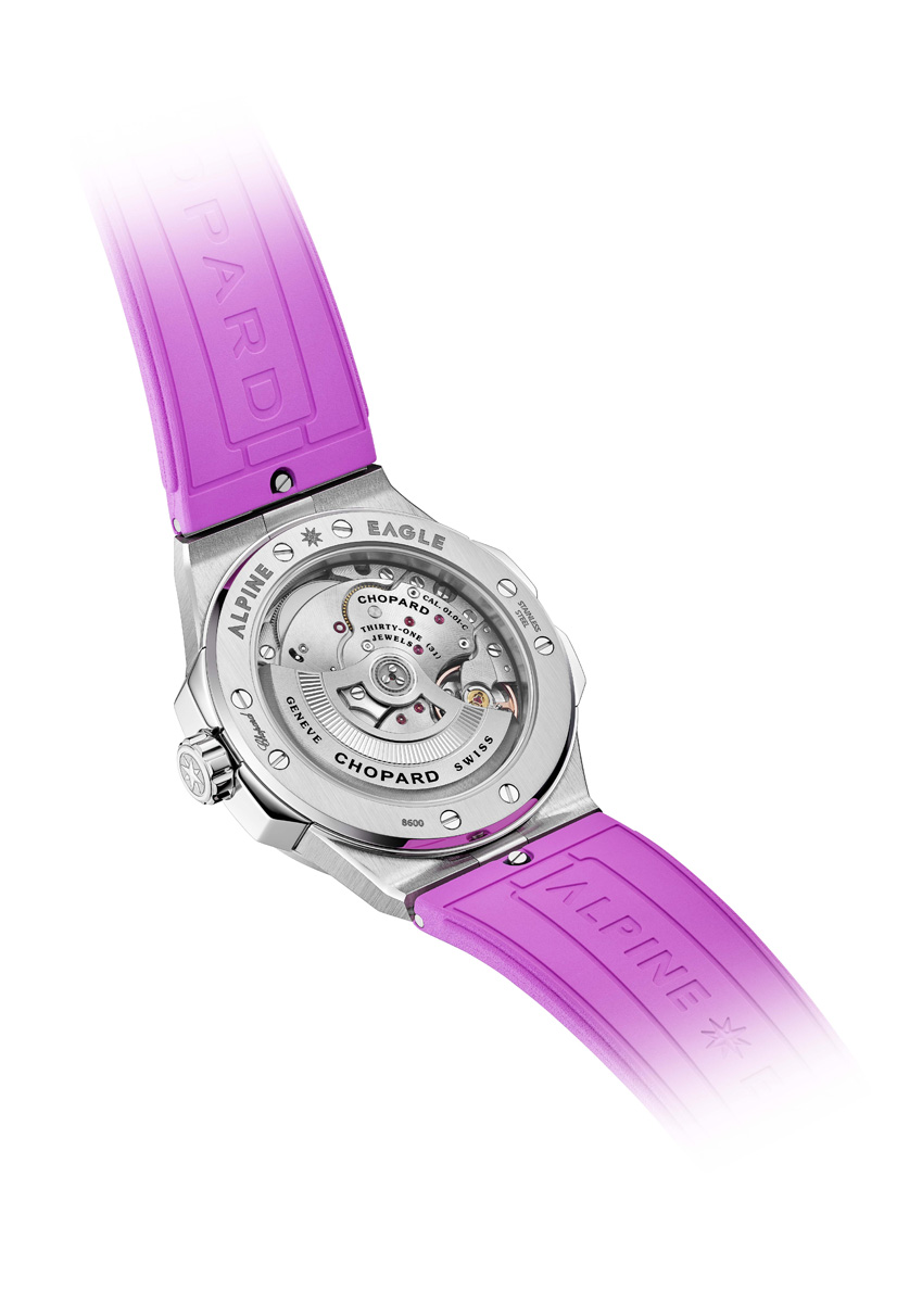 The bezel’s gradient of baguette-cut sapphires, meticulously selected and set by hand, mirrors the dial’s colour and showcases the Maison’s exceptional expertise in gemsetting. This harmonious interplay of craftsmanship and design gives the Alpine Eagle 36 Summit a refined yet striking presence, evoking the serene majesty of its Alpine inspiration. At its core beats the Chopard 09.01‑C self-winding calibre, visible through a sapphire crystal caseback. Developed entirely within Chopard’s workshops and certified by the Official Swiss Chronometer Testing Institute (COSC), it reflects the Manufacture’s unwavering dedication to precision. The “Chronometer” inscription on the dial underscores this commitment. With a 42-hour power reserve and a stop‑seconds mechanism for exact time-setting, the movement ensures reliability that matches the watch’s aesthetic brilliance.