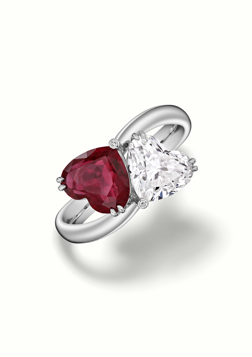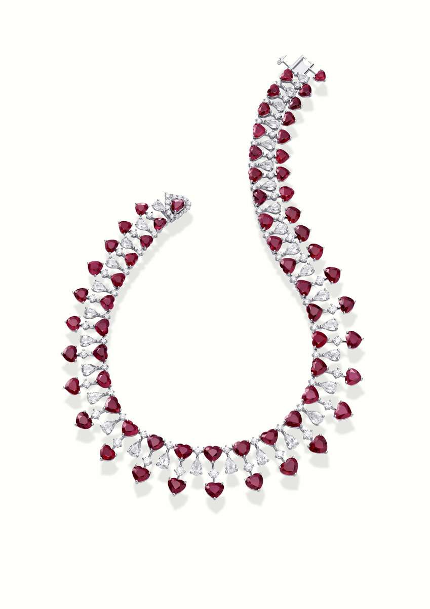 Chopard enriches its haute joaillerie universe with a breathtaking ruby and diamond parure that celebrates passion and the virtuosity of its artisans. The suite features an ethereal necklace in ethical white gold, where 64 heart‑shaped rubies—over 110 carats in total—interlace with diamonds in a delicate, lace‑like composition, radiating both fire and purity. Its counterpart, a Toi et Moi ring uniting a heart‑shaped ruby and diamond, echoes this symbolism of two souls intertwined. Long associated with love and vitality, the ruby becomes even more expressive in this heart‑cut form, embodying the generosity and joie de vivre central to the Maison’s identity. Brought to life by artisans mastering more than 30 artistic crafts, and guided by Caroline Scheufele’s creative vision, this ensemble stands as a luminous testament to Chopard’s enduring excellence in high jewellery.
