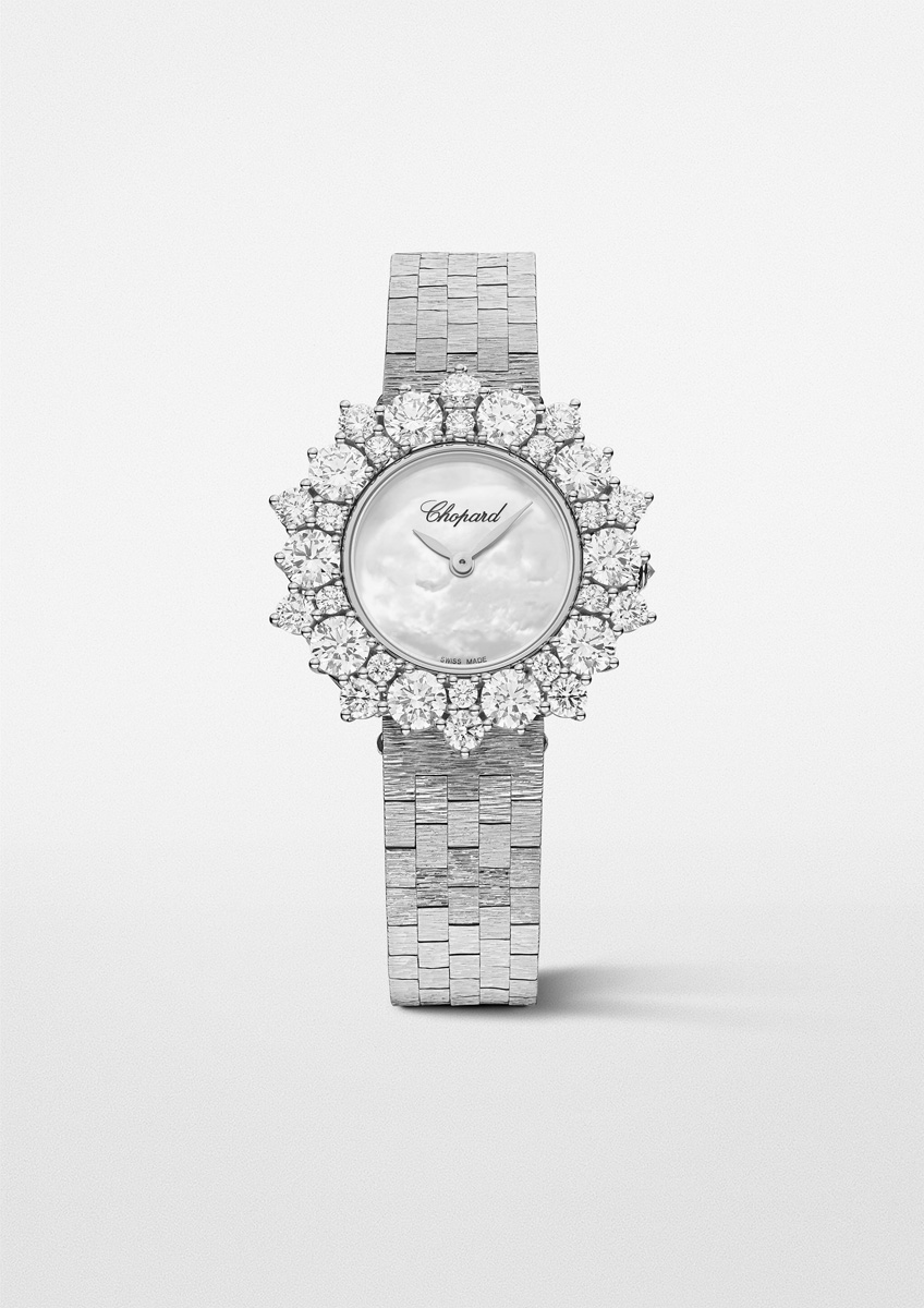 Chopard enriches its L’Heure du Diamant universe with a new 30 mm creation that perfectly embodies the Maison’s fusion of haute joaillerie and fine watchmaking. Crafted in ethical white gold, the watch glows with a textured mother‑of‑pearl dial framed by a dazzling constellation of diamonds set using Chopard’s signature crown‑setting technique, which allows each stone to radiate with exceptional brilliance. The luminous dial, paired with leaf‑shaped hands and a supple bark‑pattern bracelet inspired by a 1960s family savoir‑faire, creates an impression of refined softness and natural elegance. Beneath this artistry lies the ultra‑compact Chopard 10.01‑C manual‑winding movement, offering a 45‑hour power reserve and demonstrating the technical mastery that elevates this jewel-like timepiece into a true horological treasure.