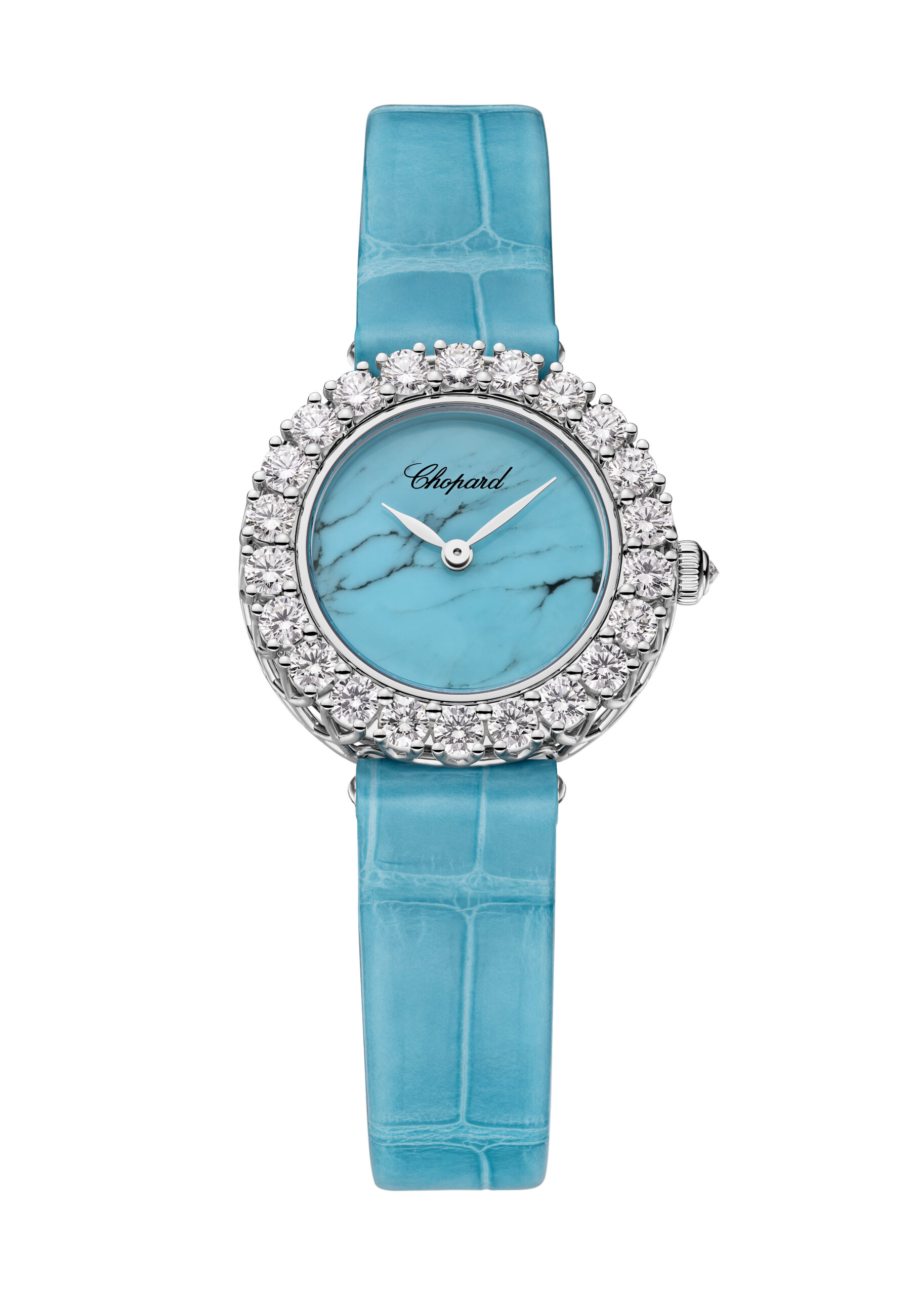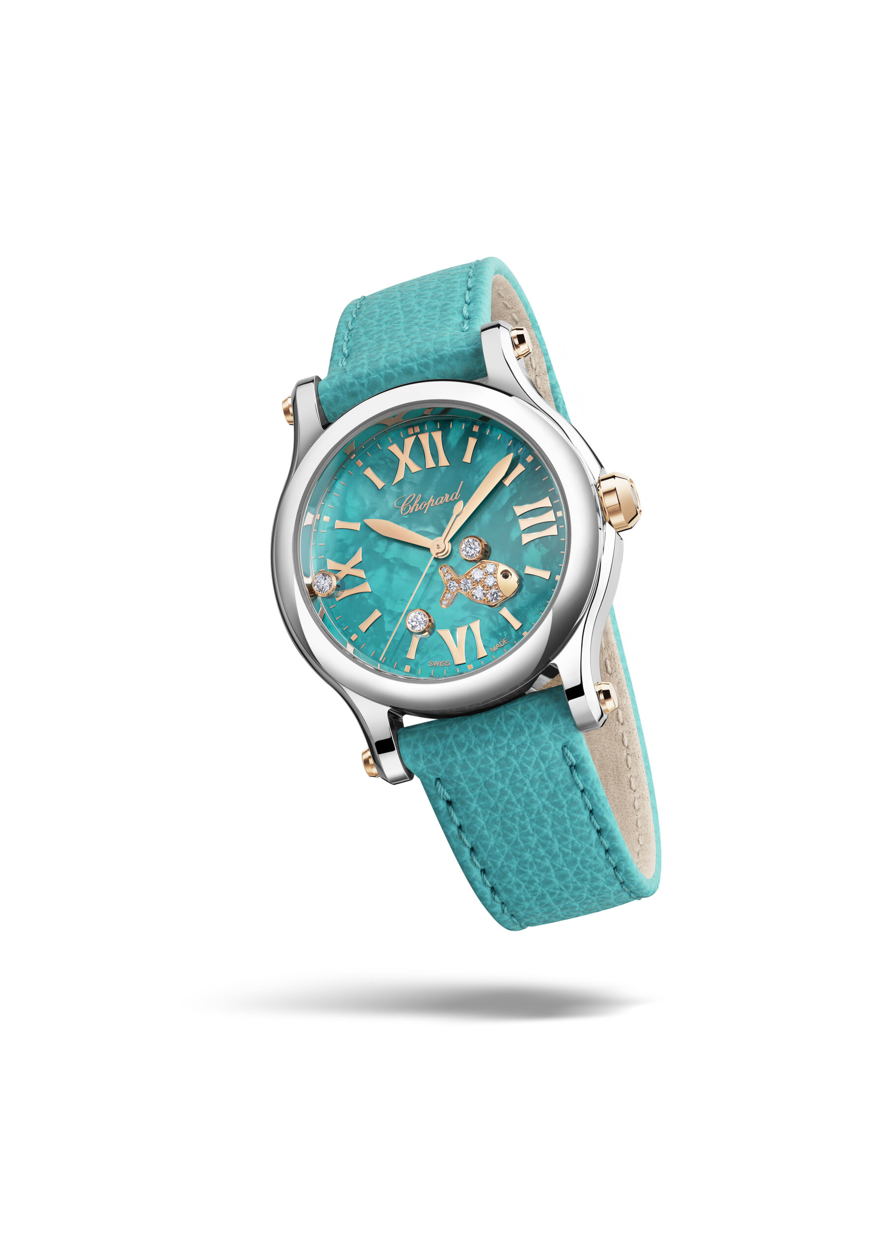 First introduced in 1998 as a marine-inspired evolution of the Happy Sport collection, the Happy Fish line captures a spirit of fantasy and freedom. This latest limited edition—just 250 pieces—brings modern refinement to a beloved classic, with signature touches like sapphire cabochons on the lugs and crown, and a commemorative caseback engraving honoring its heritage. The dial’s delicate texture, achieved through expert craftsmanship and tinted to evoke sunlit waters, serves as the perfect stage for the luminous ballet of gemstones. A matte turquoise calfskin strap completes the coastal aesthetic, held in place with a Lucent Steel™ buckle.