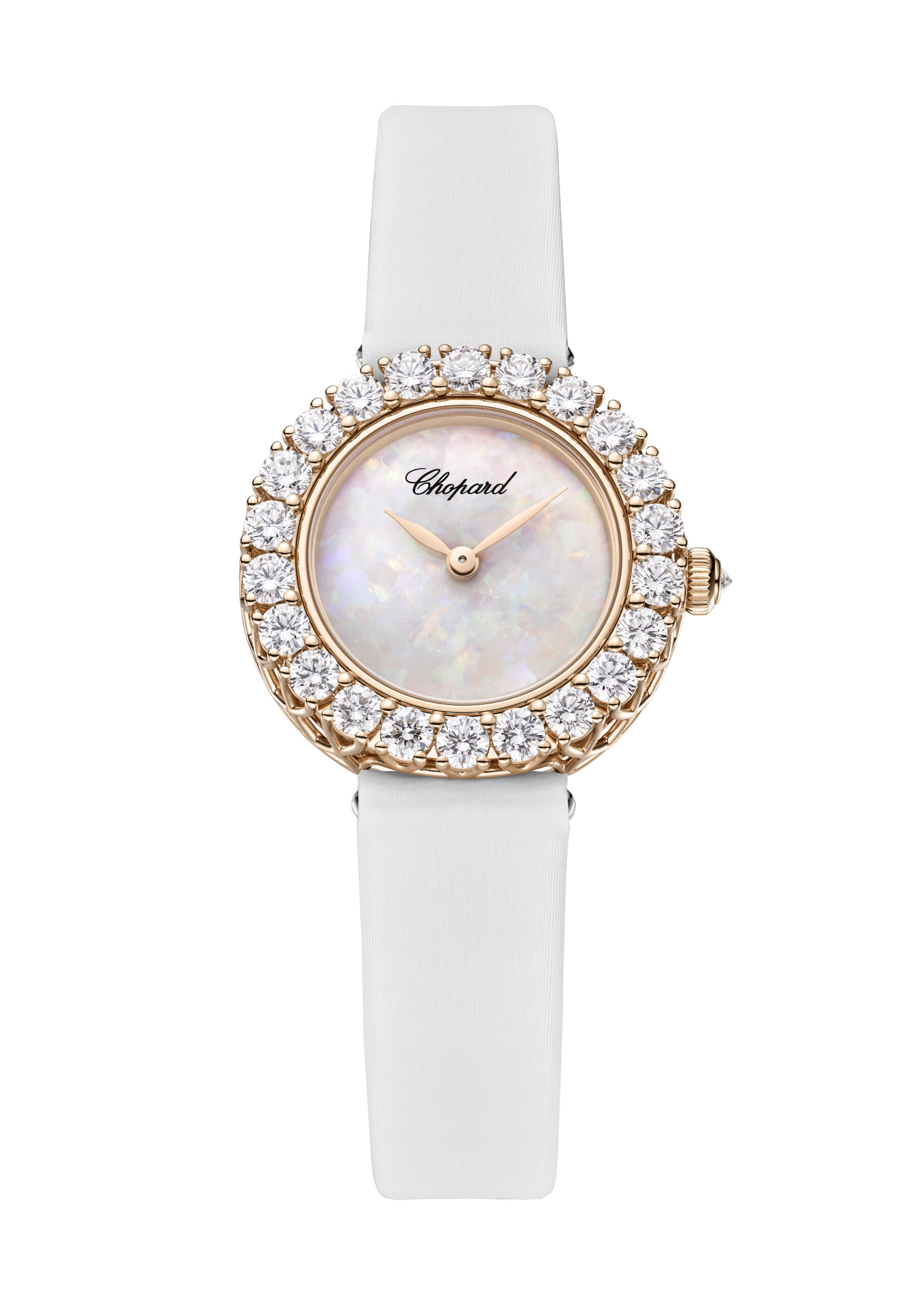 Signature crown-set diamonds encircle each dial like a luminous diadem, magnified by V-prong settings that invite light to dance freely. This innovative technique, pioneered by Karl Scheufele, elevates each gem’s brilliance and renders the metal framework nearly invisible—allowing diamonds to shine as if suspended in air. Two standout models wear bark-textured gold bracelets that mimic the look and feel of nature’s veins—a triumph of artisanal metalwork passed down through generations. Others feature softly colored satin or leather straps, handpicked to echo each dial’s hue. The delicately engineered 10.01-C calibre powers each creation with a 45-hour reserve, its compact form a marvel of in-house innovation. Designed and assembled entirely in Chopard’s Swiss ateliers, it speaks to a legacy of mechanical excellence seamlessly embedded within a jewel’s silhouette.