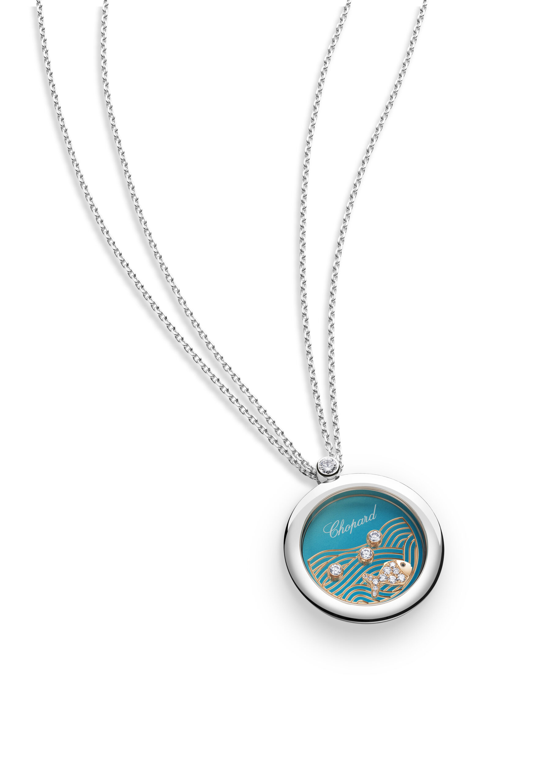 Echoing this aquatic charm, the Happy Fish pendant features a gently rippling turquoise gradient over engraved gold waves, setting the stage for the same dancing diamonds and charming fish motif. Together, the watch and pendant embody a joyful harmony, rooted in the sea’s serenity and Chopard’s unwavering dedication to elegance.