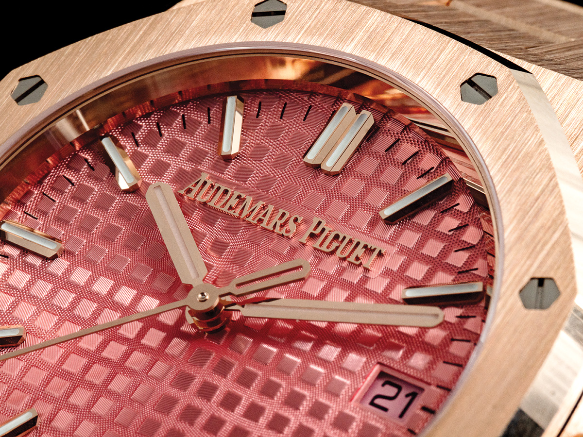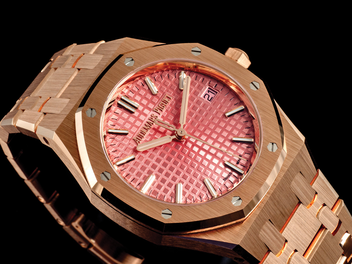 The models presented today differ little to nothing from the original model. Despite its 50 years of existence, this look is fresher than ever. The newest 34mm Royal Oak Selfwinding watch boasts a case and bracelet entirely made of 18-carat pink gold. Audemars Piguet’s signature touch – the alternation of satin-brushing and polished chamfers – takes center stage. This meticulous finishing technique not only highlights the warm tones of the pink gold but also creates a captivating interplay of light across the surfaces.