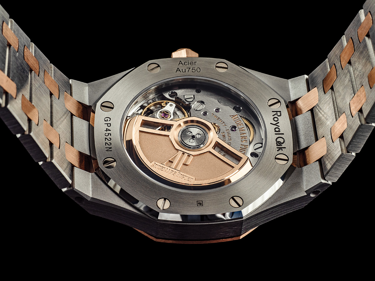 The second timepiece embraces a contemporary two-tone aesthetic, achieved by combining stainless steel and 18-carat pink gold. The bezel, crown, and bracelet studs are crafted in warm pink gold, creating a striking contrast with the stainless steel of the case middle, the caseback, and the bracelet links. Even the AP folding clasp, made of stainless steel, receives a touch of pink gold for a cohesive design. Both materials are finished with an elaborate alternation of satin brushing and polished chamfer. The case is 8.8mm thick and 34mm in diameter, ensuring a proportional look and a comfortable wear.