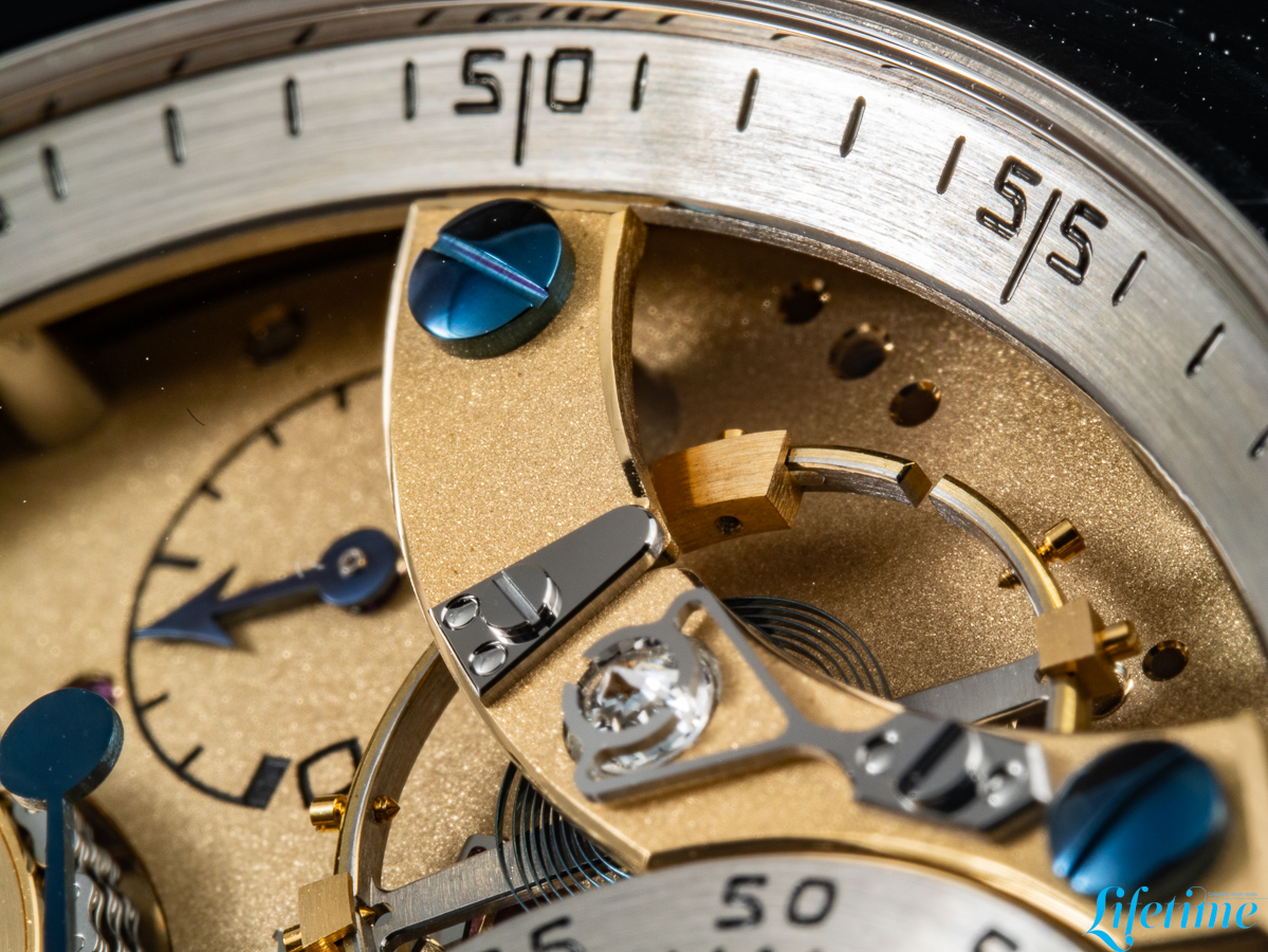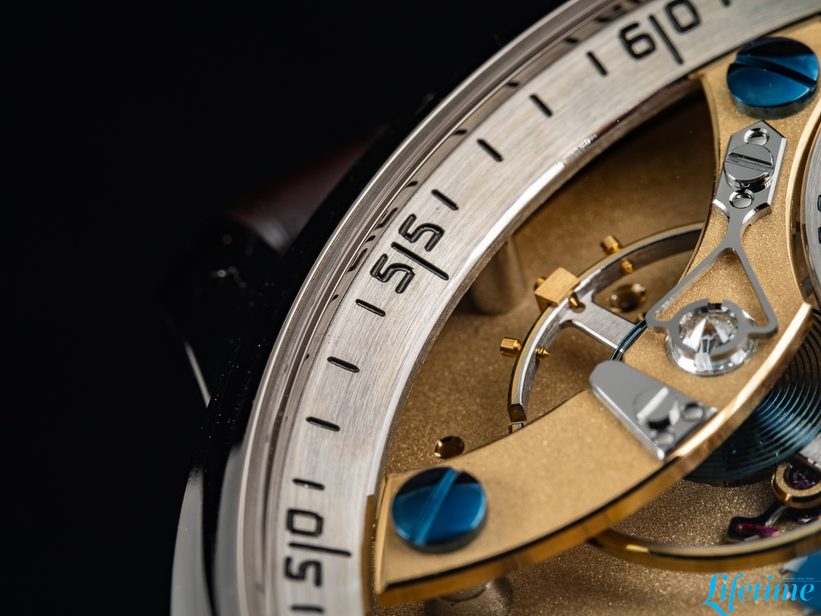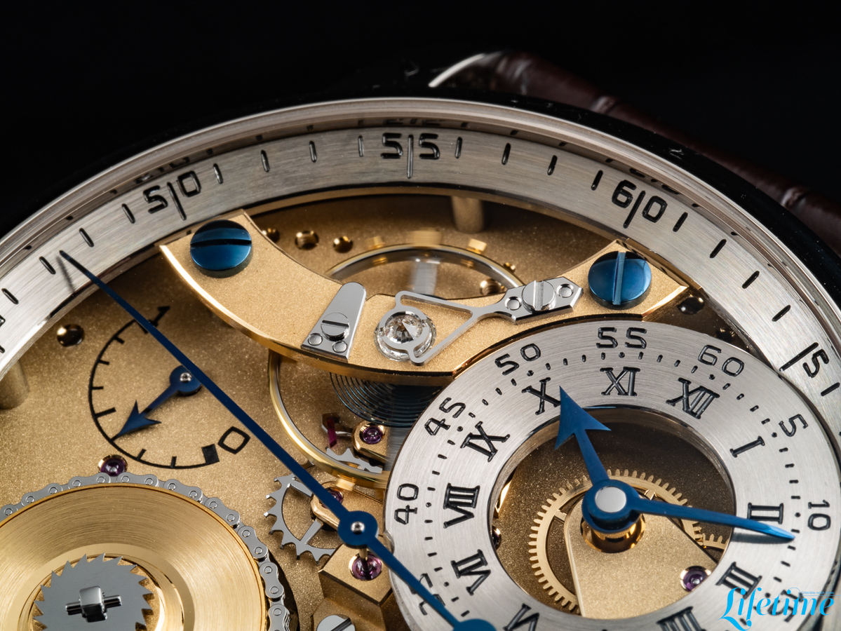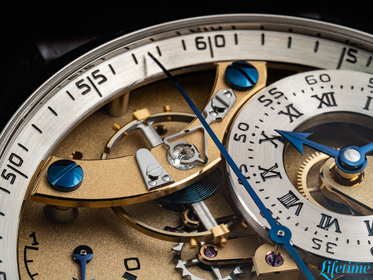 The most striking departure from conventional watchmaking is immediately apparent. The entire movement structure is visible from the dial side, with transparency becoming the defining characteristic of the watch. Two distinct dials occupy the composition, both hand-crafted from 18-carat white gold. The primary dial, which displays the hours and minutes, is positioned off-centre between one and two o’clock, echoing Ferdinand Berthoud‘s Astronomical Pocket Watch No. 3. Roman numerals mark the hours while Arabic numerals indicate minutes – a differentiation that extends to the hands themselves: the minute hand has a bevelled tip, while the hour hand features an arrow configuration.