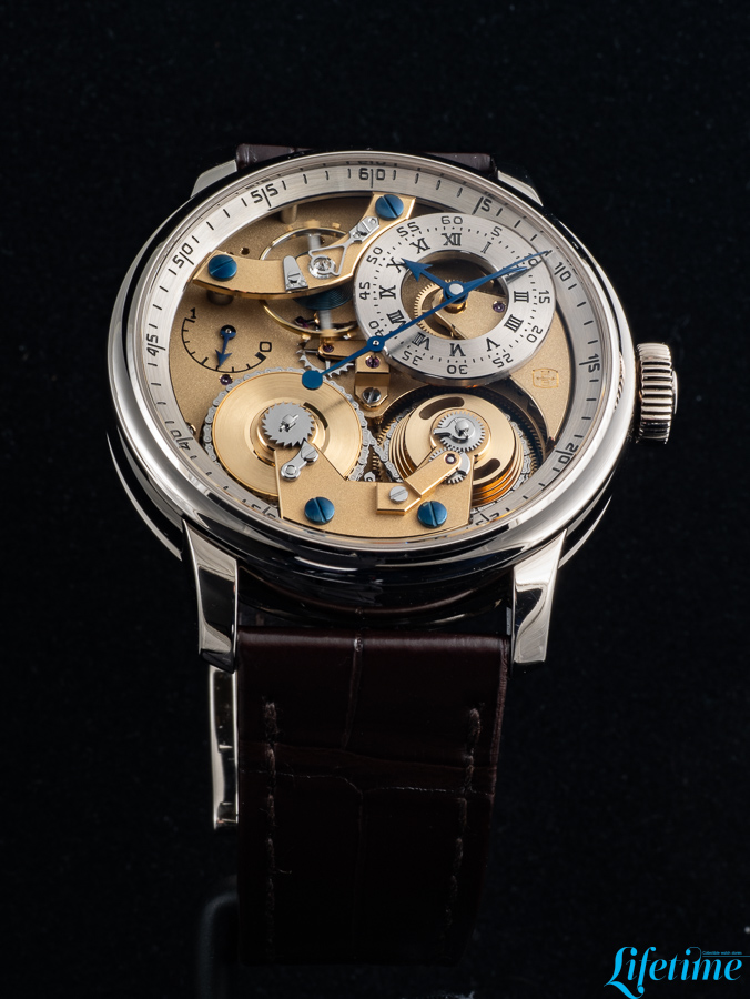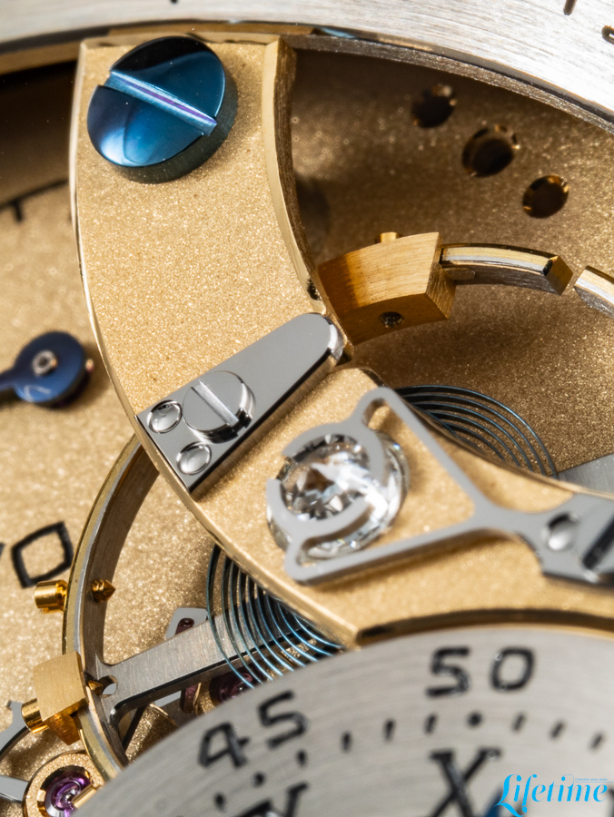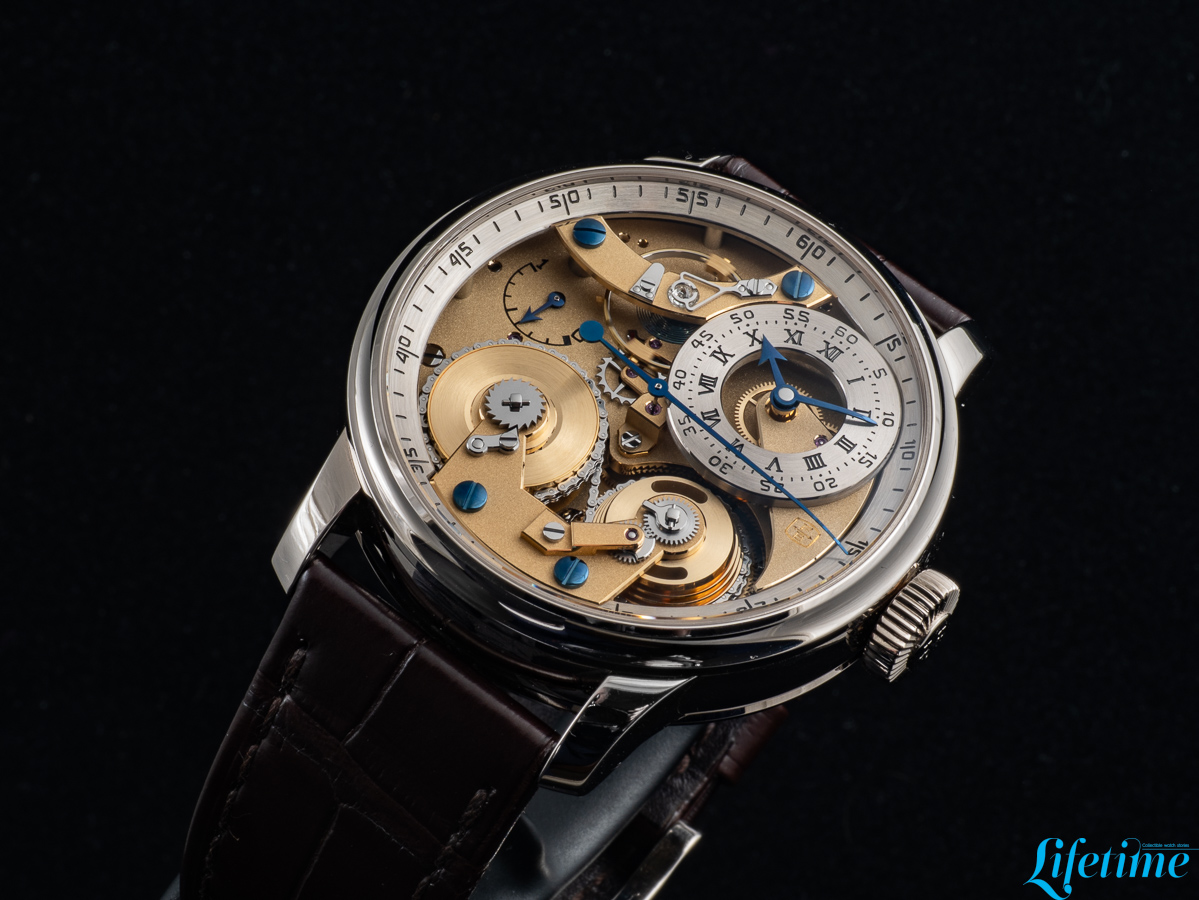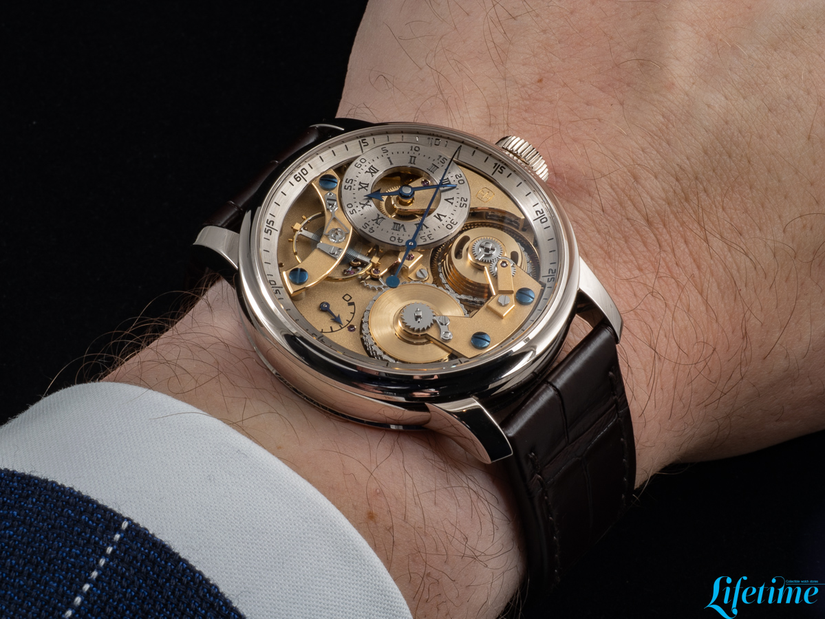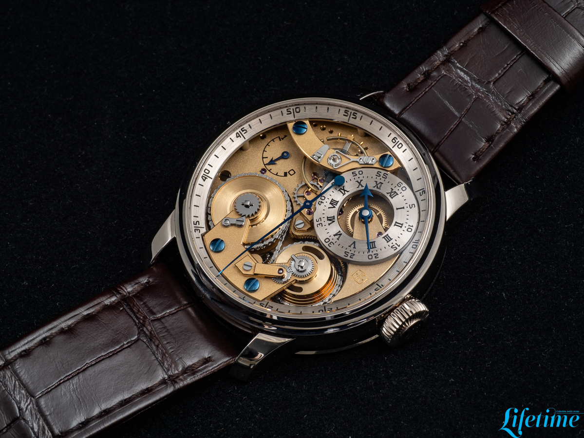 The most striking departure from conventional watchmaking is immediately apparent. The entire movement structure is visible from the dial side, with transparency becoming the defining characteristic of the watch. Two distinct dials occupy the composition, both hand-crafted from 18-carat white gold. The primary dial, which displays the hours and minutes, is positioned off-centre between one and two o’clock, echoing Ferdinand Berthoud‘s Astronomical Pocket Watch No. 3. Roman numerals mark the hours while Arabic numerals indicate minutes – a differentiation that extends to the hands themselves: the minute hand has a bevelled tip, while the hour hand features an arrow configuration.