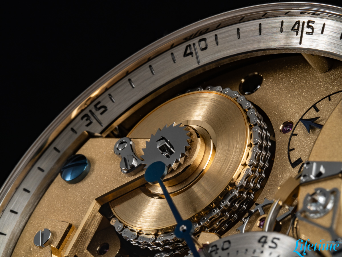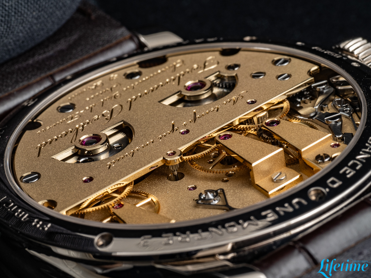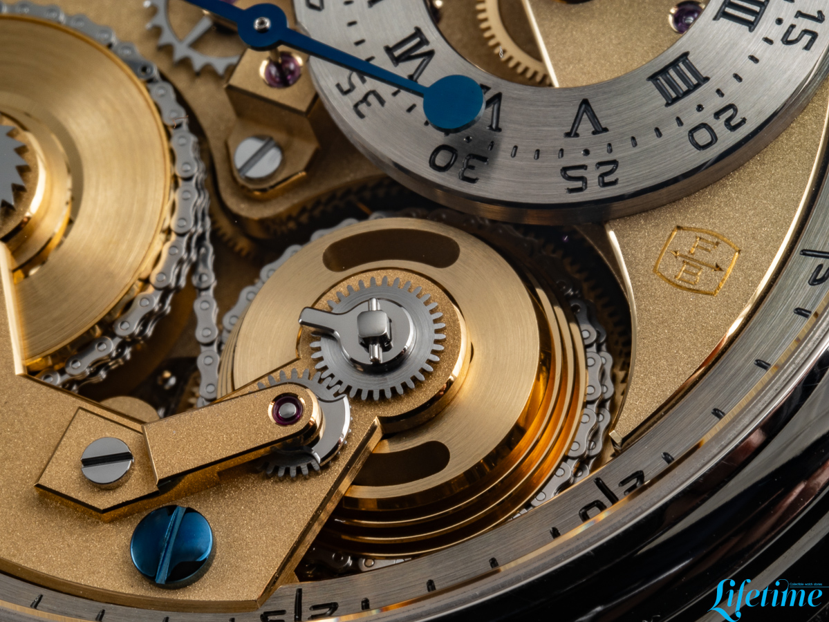 This movement measures 37.50mm in diameter and 8.35mm in thickness; it operates at a frequency of 21,600 vibrations per hour and provides 50 hours of power reserve. Its architecture draws directly from Ferdinand Berthoud‘s Astronomical Pocket Watch No. 3, incorporating a fusée-and-chain mechanism that addresses the fundamental problem of varying mainspring torque.