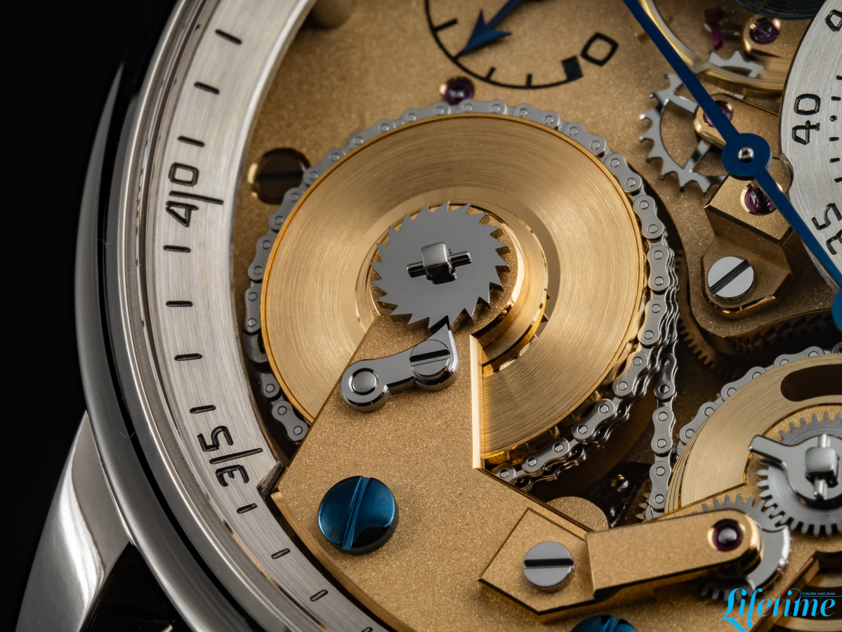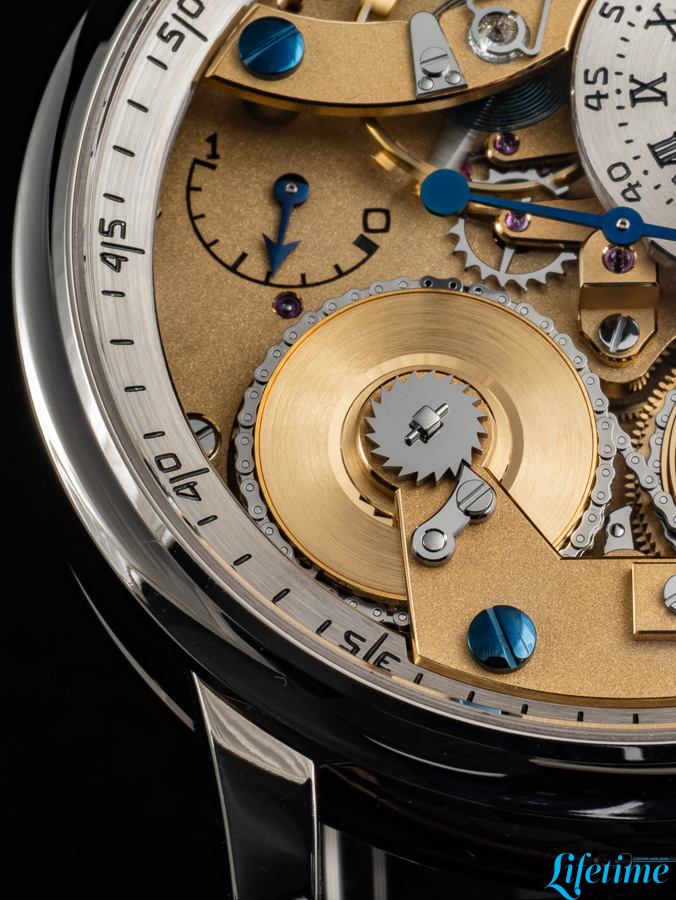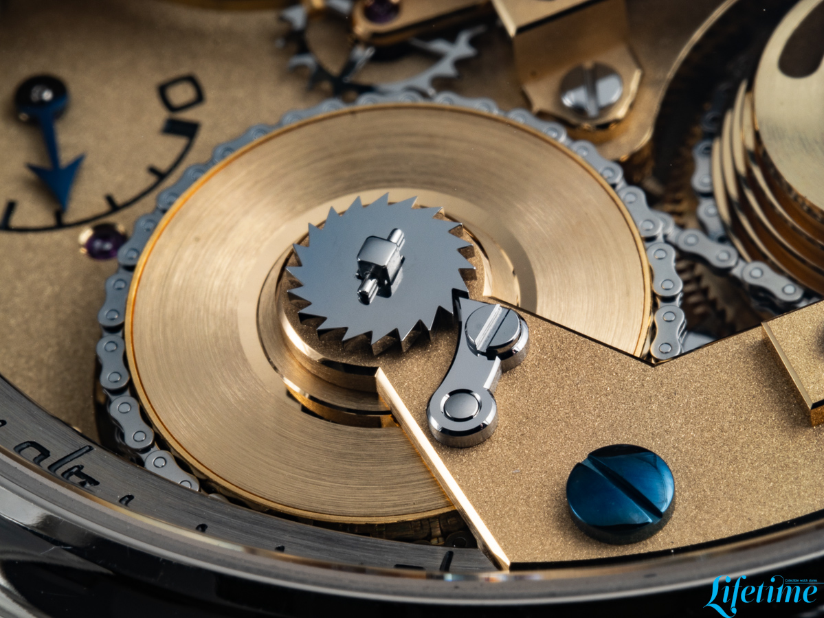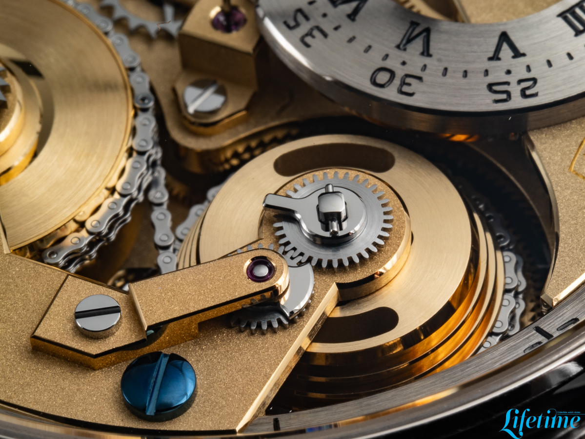 This movement measures 37.50mm in diameter and 8.35mm in thickness; it operates at a frequency of 21,600 vibrations per hour and provides 50 hours of power reserve. Its architecture draws directly from Ferdinand Berthoud‘s Astronomical Pocket Watch No. 3, incorporating a fusée-and-chain mechanism that addresses the fundamental problem of varying mainspring torque.