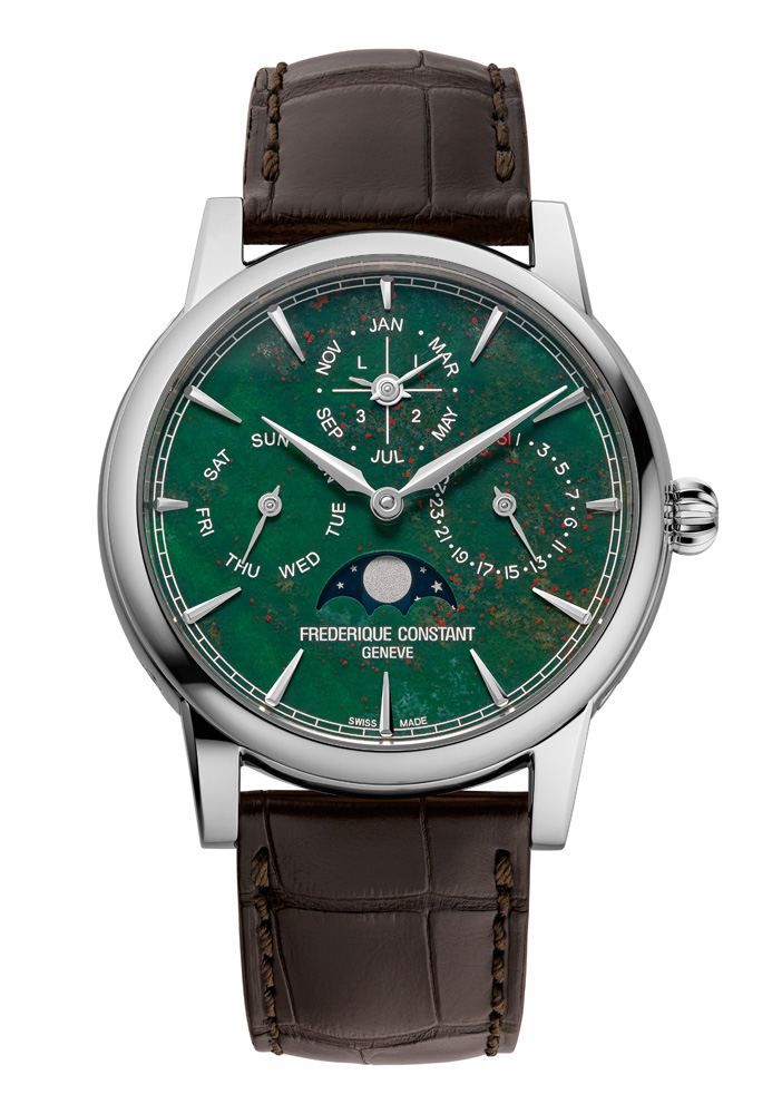 At the heart of the collection sits the Classic Perpetual Calendar Manufacture, described by the Maison as the “queen of complications.” Its dial is carved from heliotrope, a stone rich in aluminium, iron and potassium that produces graceful inclusions and a living texture beneath the hands. The perpetual calendar module — a signature Frederique Constant complication — handles day, date, month and leap‑year indications with mechanical intelligence, automatically accounting for month lengths and leap years; the heliotrope backdrop transforms the technical display into a miniature geological tableau.