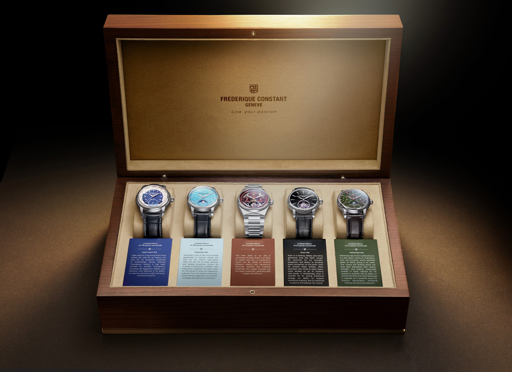 Across the collection, Frederique Constant’s manufacture movements are presented with attention to finishing and user experience rather than mere technical showmanship. Cases and components are executed to the Maison’s standards, with polished and satin surfaces that frame the mineral dials without overpowering them. The limited run of 37 sets ensures that each owner receives not only a suite of mechanically significant watches but also a curated expression of the brand’s aesthetic — where movement architecture and natural stone meet.