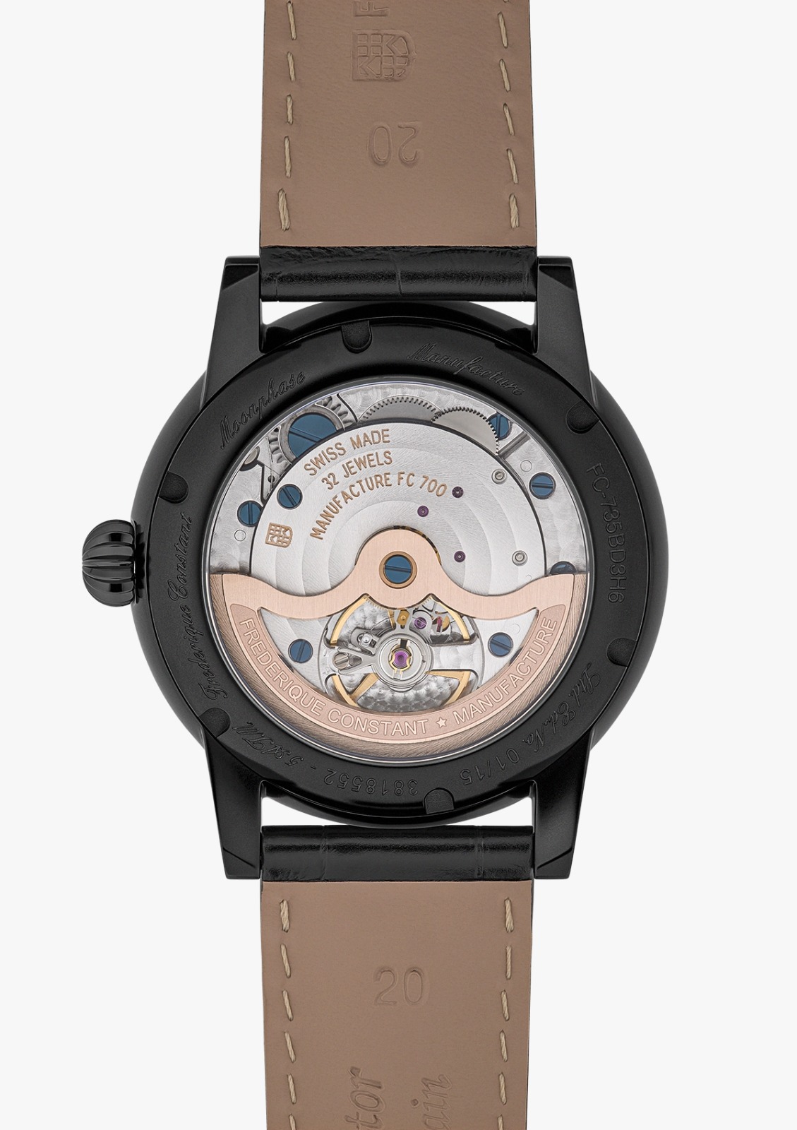 This exclusivity alone would make it a collector’s treasure, yet the true significance of the model lies in the mechanical ingenuity and aesthetic mastery that define every detail. At its core beats the in‑house automatic caliber FC‑735, a movement that represents a major milestone for the Maison. Composed of 32 jewels and operating at a frequency of 28,800 vibrations per hour, it delivers a robust 50‑hour power reserve while integrating three complications—big date, moonphase, and power reserve indicator—into a single, crown‑adjustable system.