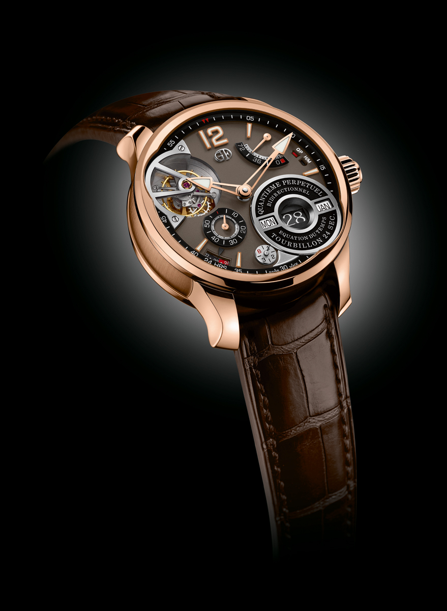 The multi-level chocolate-coloured gold dial of this millesime edition timepiece contrasts harmoniously with the 5N red gold case and underlines the intuitive linear calendar display. Herein lies the happy paradox: it is an ultra-complicated timepiece with complete perpetual calendar, tourbillon and Equation of Time function, however, it is just as easy to use and adjust as a three hands watch. Thanks to the bi-directional correction, it can be easily adjusted in both directions without risk of damage to the movement.