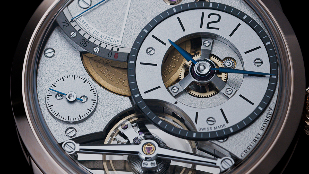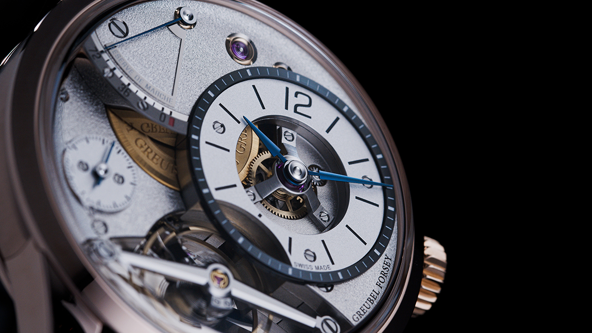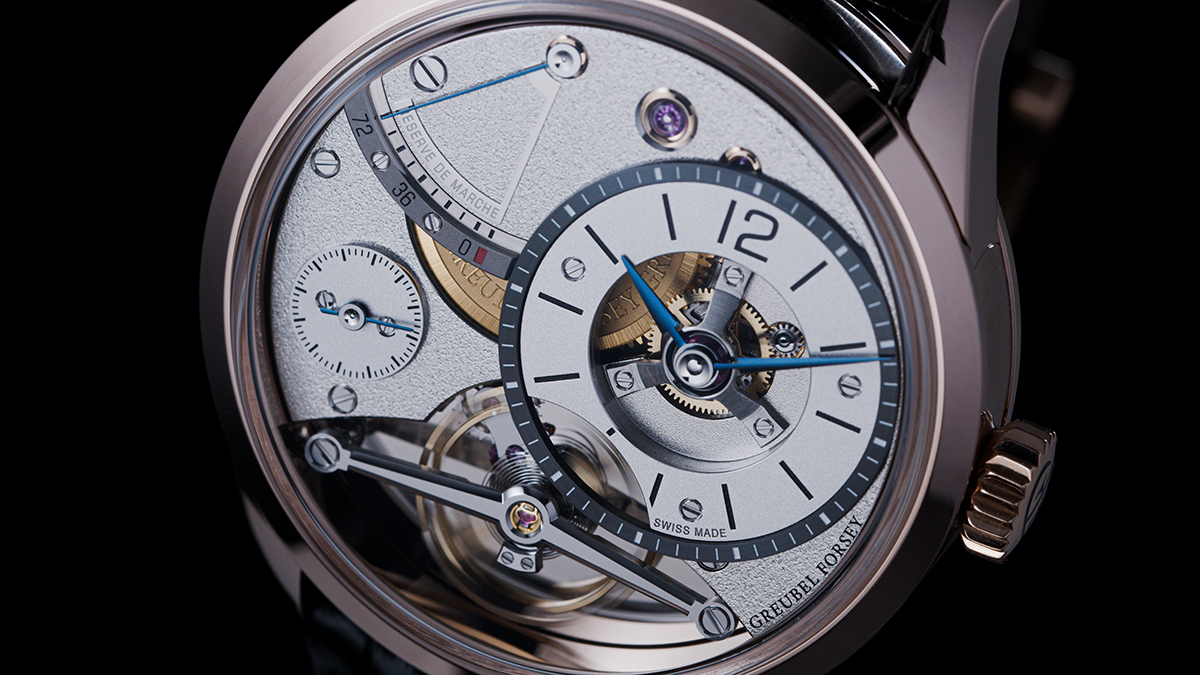 The Balancier Contemporain intends to takes us on an architectural voyage. The journey begins with a black polished gold plate where the balance wheel takes pride of place at 6 o’clock. Higher up, a frosted and bevelled bridge reveals the barrel drum with Greubel Forsey engraving. At 8:30, the small seconds hand moves on a slightly higher level. Higher up still, a hand-frosted bridge displays the 72-hour power reserve, which is brought to life by a slender blued steel hand. Further east, at 2 o’clock, the contrasting colours accentuate the temporal indications, and the off-centre position of the hour/minute dial is accentuated by the anthracite finish of the minute circle. Positioned on a raised tripod bridge, the hours and minutes are displayed by two blued steel hands with a hand-polished flat surface and countersinks. The voyage ends with an opening in the dial that allows a glimpse of the large balance wheel, with its bevelled and black-polished bridge.