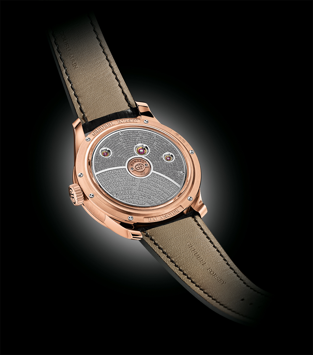 The caseback of this timepiece reveals a true work of art created with all the mastery of traditional artisanal hand finishing of Greubel Forsey timepieces. A circular engraved red gold disc is displayed in the centre, surrounded by a white gold bridge, which features the Atelier’s key values written in engraved and black-polished letters, along with the characteristic olive-domed jewels set in gold chatons.