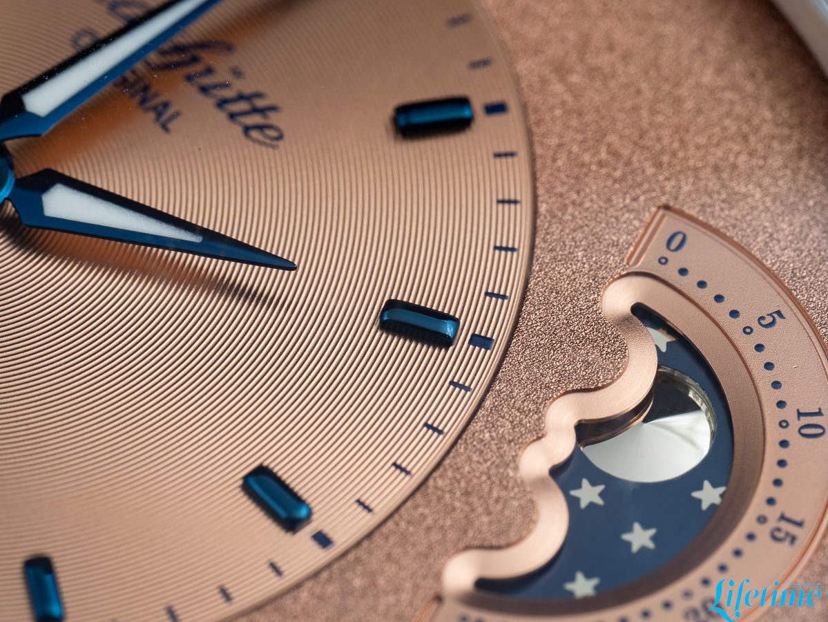Both the moon phase display, which features a miniature night sky of silver stars against a deep blue background, and the Panorama Date with its blue discs and crisp white numerals, are produced in-house, highlighting the maison’s mastery over both artistry and engineering.