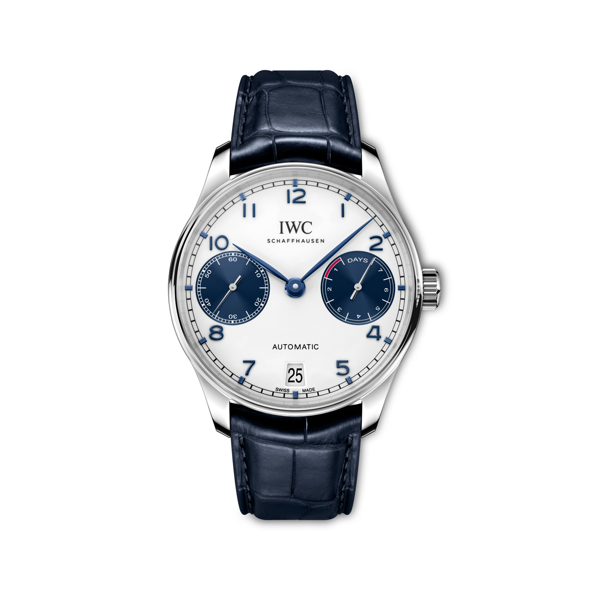 The Portugieser Automatic (Ref. IW500715) features a stainless steel case with a diameter of 42.3 millimetres, a white and blue dial, and blued feuille hands. The balanced dial layout places the small seconds at 9 o’clock and the power reserve display at 3 o’clock. This timepiece is powered by the IWC-manufactured 52010 calibre. Its automatic Pellaton winding system has been reinforced with components made of virtually wear-free ceramic. It uses even the slightest movements of the rotor in both directions to build up a power reserve of 7 days in two barrels. The movement can be admired through the sapphire glass case back. This timeless and elegant Portugieser is fitted with a blue alligator leather strap with a folding clasp.
