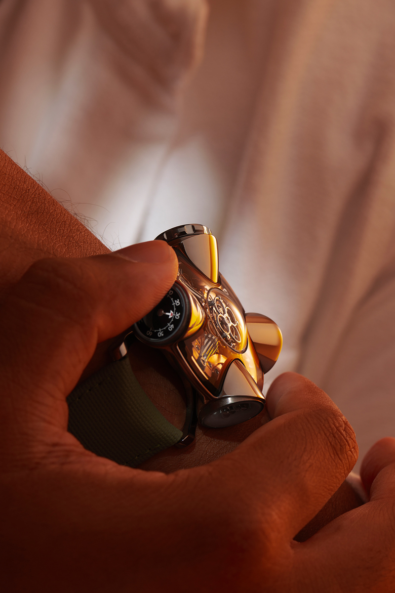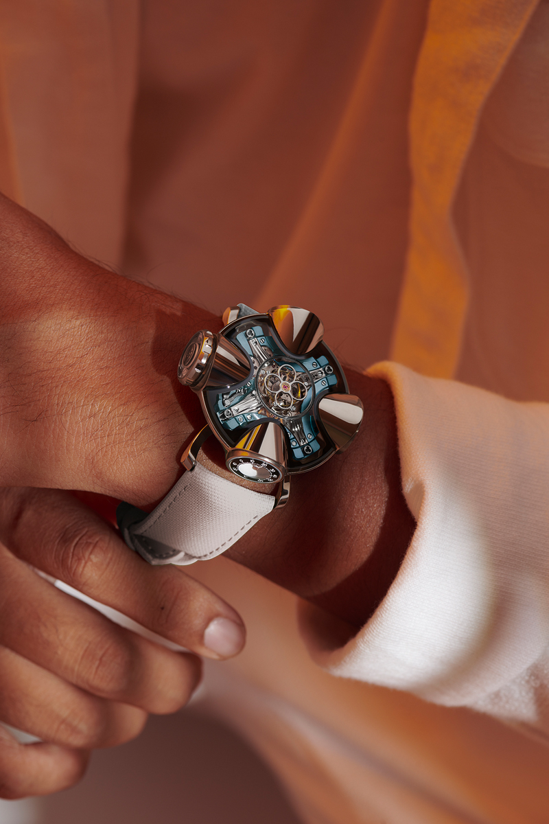While the peripheral rooms of HM11 are surrounded by exterior walls of polished grade-5 titanium, the central atrium is open to the light, covered by a double-arched sapphire crystal roof. Underneath, the in-house HM11 engine hums away, its cadence set by the 2.5Hz (18,000 vph) balance of the flying tourbillon. Plates and bridges are coloured with a physical vapour deposition (PVD) process, coming in ozone blue or the warm solar hues of 5N gold, limited to 25 pieces each for the two launch editions of HM11.
