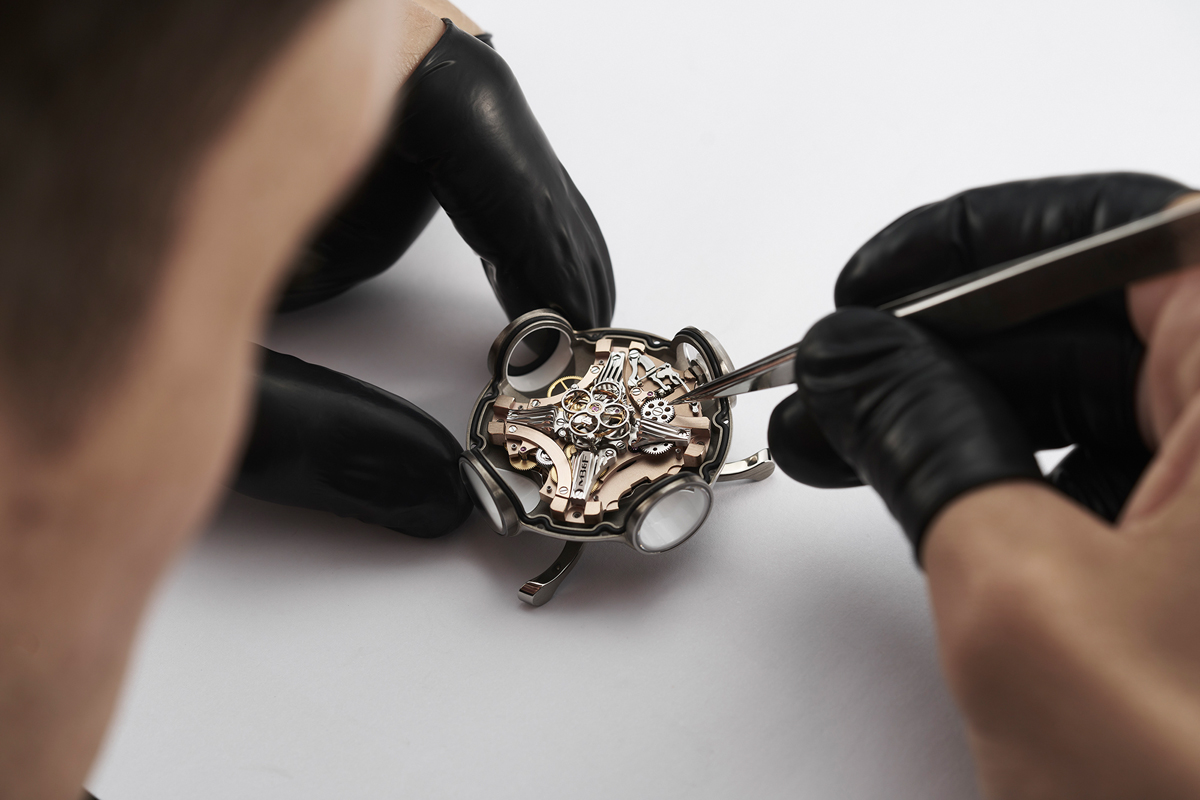 The materials chosen to represent the two launch editions of HM11 Architect are titanium and sapphire crystal. Both are known for being extremely challenging to machine, such that it was only within the last two decades that their use became feasible in watches of complex form. The lower half of the HM11 case is a highly three-dimensional Grade-5 titanium shell with different inner and outer surface profiles. The upper caps of each of the four HM11 rooms are machined separately, since they can be affixed only after the movement has been installed. Close to a week is required to complete the HM11 case, comprising all the operations of milling, finishing and quality control.