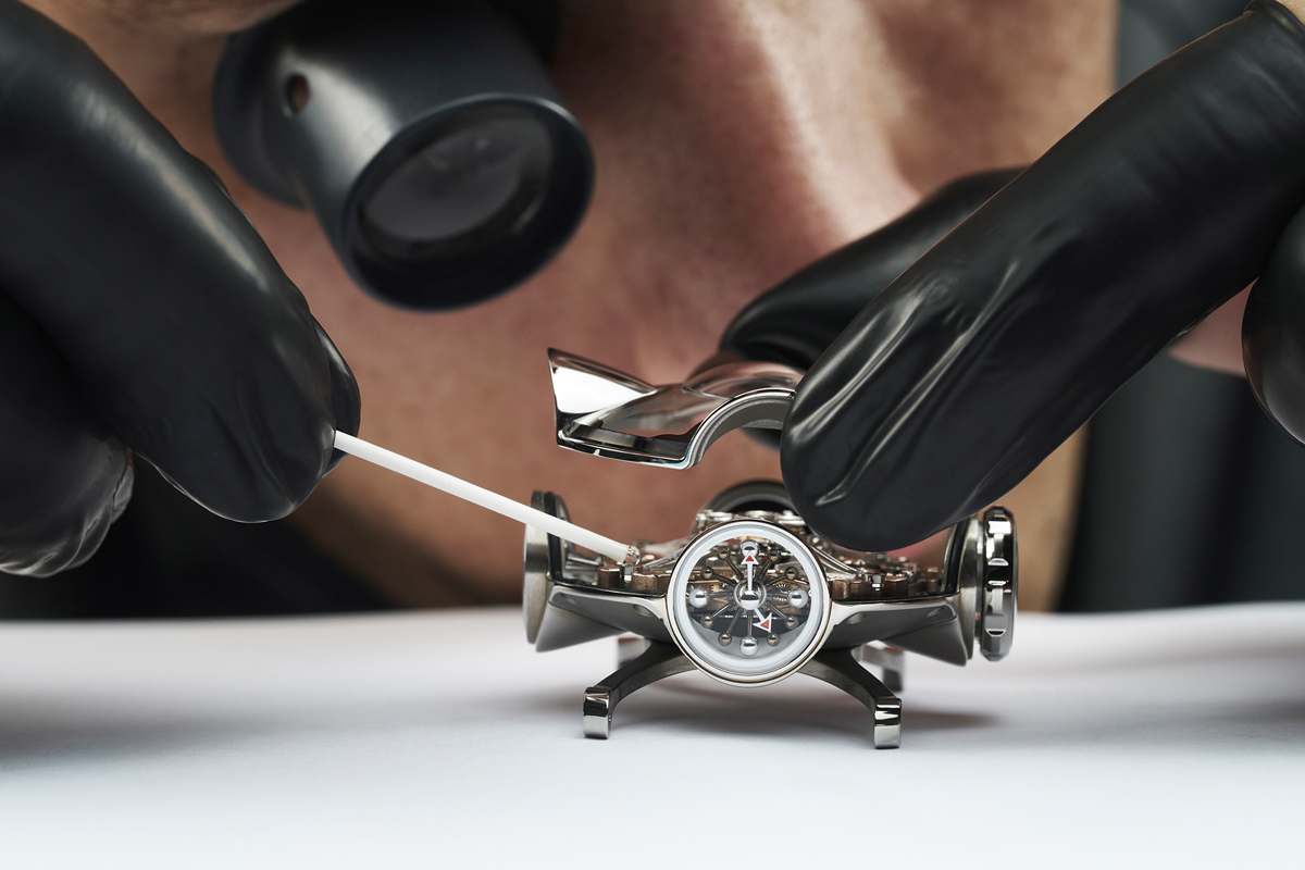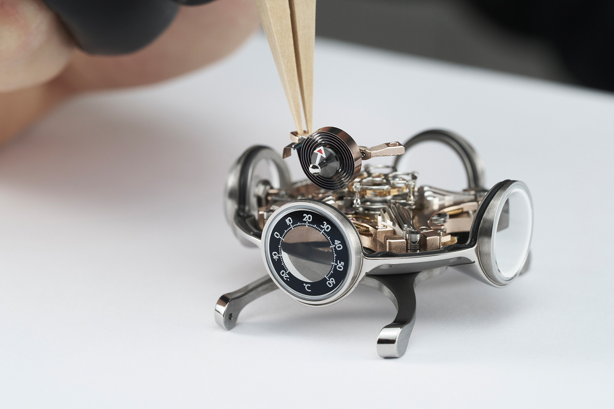 These are not simple coiled springs made from wire, but custom springs laser-cut out of a low-carbon high-hardness steel tube with chrome finish. The specific alloy composition and crystalline structure of this steel provide exceptional resistance to wear, while its finish and cylindrical form impart aesthetic value — despite the fact that the springs are completely hidden from view. Such springs are used nowhere else in modern watchmaking except at MB&F, and are derived from technologies designated primarily for the aerospace industry.