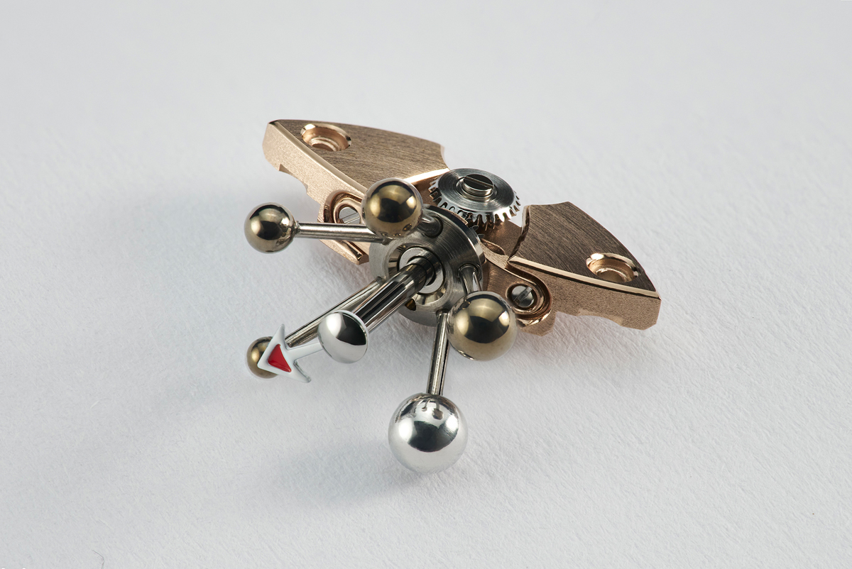The next room, 90° to the left, is where the power reserve display resides. Following the design schema established by the time room, rod-mounted orbs are paired with a red-tipped arrow to show how much running autonomy is left in the HM11 barrel. Proceeding clockwise, the five orbs increase in diameter until the final polished aluminium orb, 2.4mm in diameter, indicating the full 96 hours of power reserve.