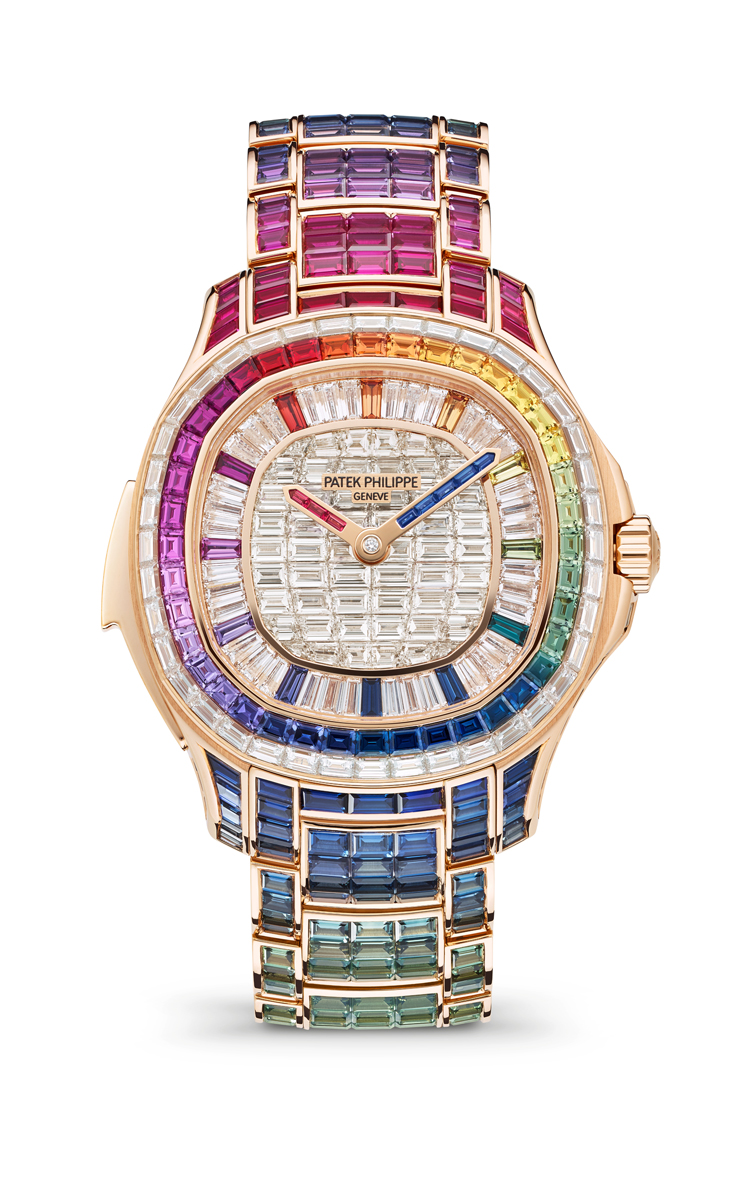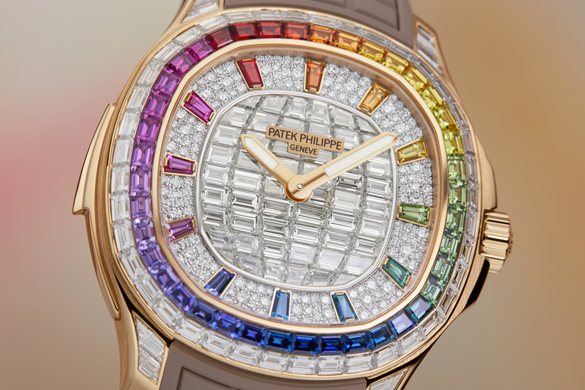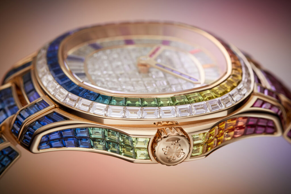 Available exclusively in the Patek Philippe Salons in Geneva, Paris and London, during the introductory phase, the new Aquanaut Luce “Rainbow” Minute Repeater Haute Joaillerie Reference 5260/1455R-001 is paved throughout with 130 baguette-cut diamonds (8.66 ct) on the dial and the outer row of the bezel and 779 multicolored baguette-cut sapphires (45.05 ct) on the inner row of the bezel, the flanks of the case, the minute-repeater slide piece and the rose-gold bracelet. To intensify the radiance of this precious adornment, Patek Philippe called on the sophisticated technique of “invisible setting” for the dial center, the bezel and the caseband, as well as the flanks and central links of the bracelet. The dial is notable for its excellent legibility – with 12 multicolored baguette-cut sapphire hour markers, an hour circle in baguette-cut diamonds, an hour hand set with three baguette rubies, and a minute hand lit by five baguette-cut blue sapphires, while the hole in the cannon carrying the hands is set with a brilliant-cut diamond. The rose-gold bracelet is endowed with a patented Patek Philippe fold-over clasp secured by four independent catches.