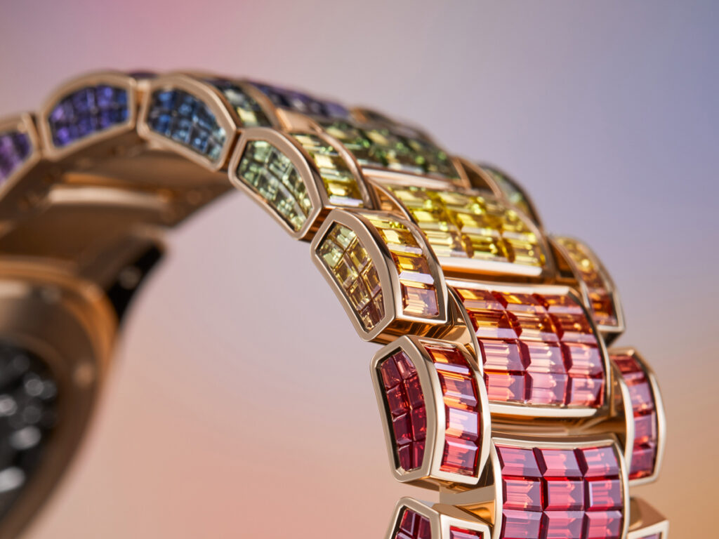 The dial plays subtly on the shape of the gems and the way they are set: a center paved with baguette diamonds (“invisible setting”), an hour circle adorned with brilliant-cut diamonds (“snow setting”) and 12 multicolored sapphire hour-markers echoing the gradient of hues on the bezel. The architecture and meticulous finish of the caliber R 27 self-winding movement are visible through a sapphire-crystal case back.