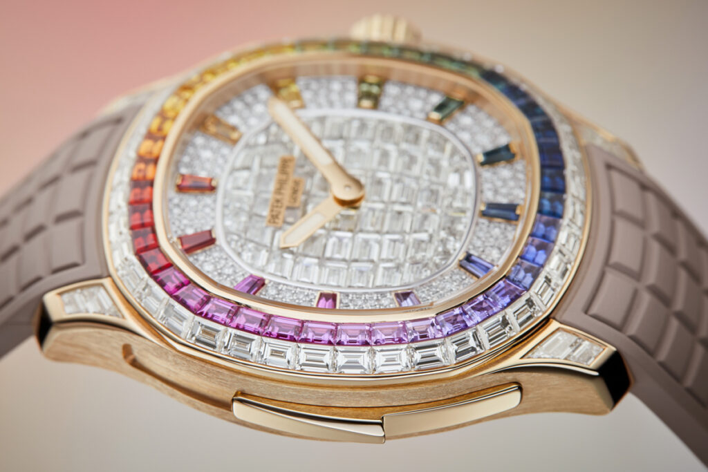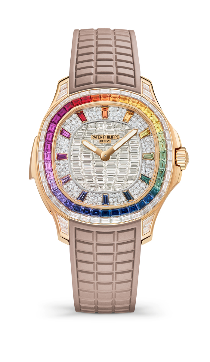 The Aquanaut Luce “Rainbow” Minute Repeater Haute Joaillerie References 5260/355R-001 and 5260/1455R-001 are the first Aquanaut minute repeaters, lit by a rainbow of diamonds and multicolored sapphires featuring the “invisible setting”.