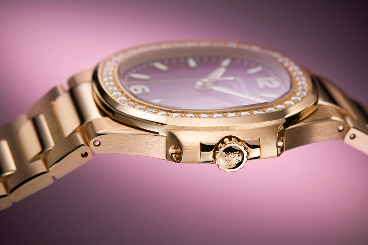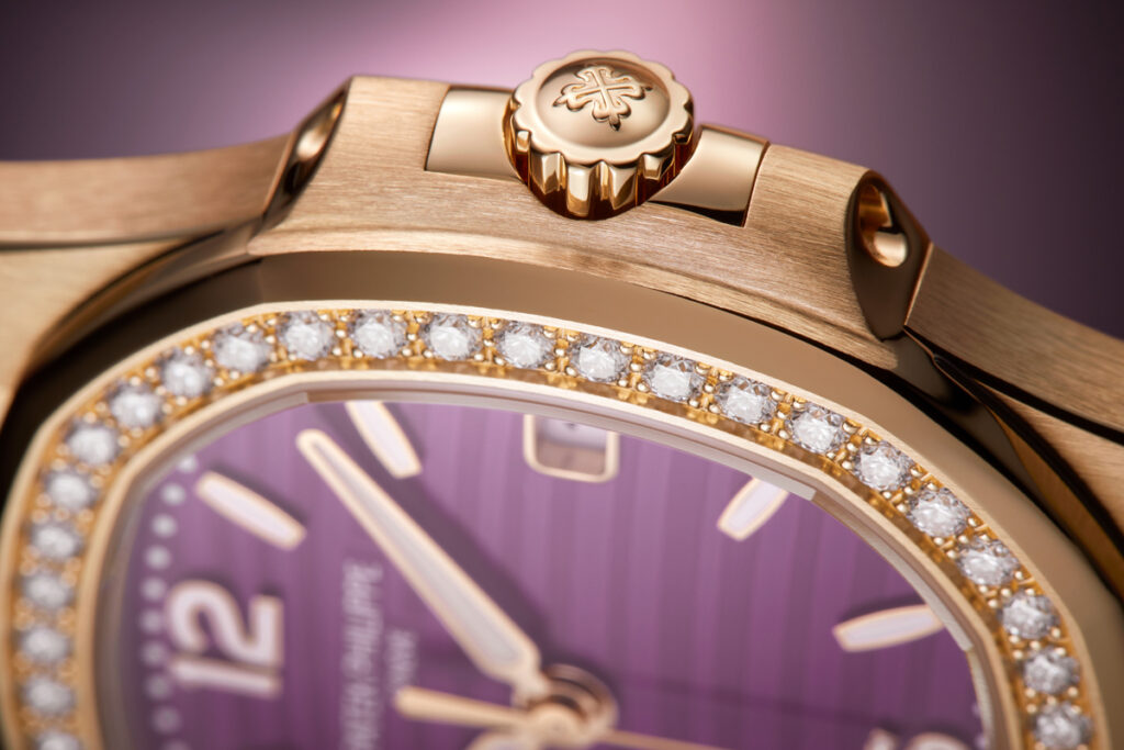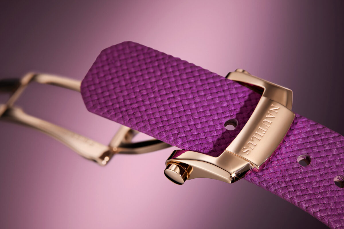 The dial, adorned with the pattern of small waves typical of the Ladies’ Nautilus collection, requires some fifty fine coats of lacquer, first translucent purple and then colorless, to create its subtle, magical sense of depth. Legibility is ensured by ogival-shaped hour markers, applied Arabic numerals and alpha-style hour and minute hands, all in rose gold with a white luminescent coating, standing out clearly against the purple background. A slender seconds hand sweeps around the dial and the date is displayed in an aperture at 3 o’clock with an applied rose-gold frame. Recognizable by its iconic porthole-inspired shape, the small case catches the eye with its alternating satin-brushed and polished finishes. The octagonal bezel sparkles with 46 brilliant-cut Top Wesselton Pure diamonds (0.8 ct) set with textbook precision.