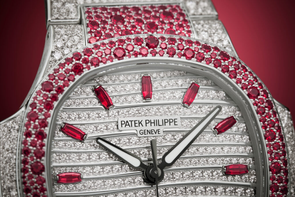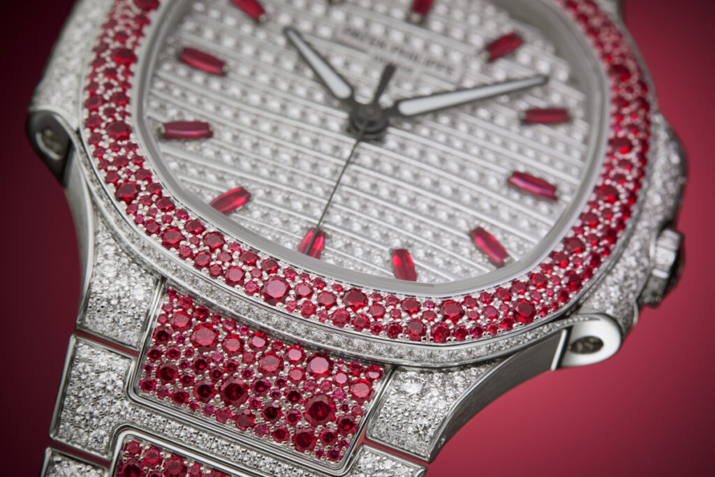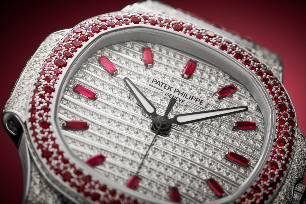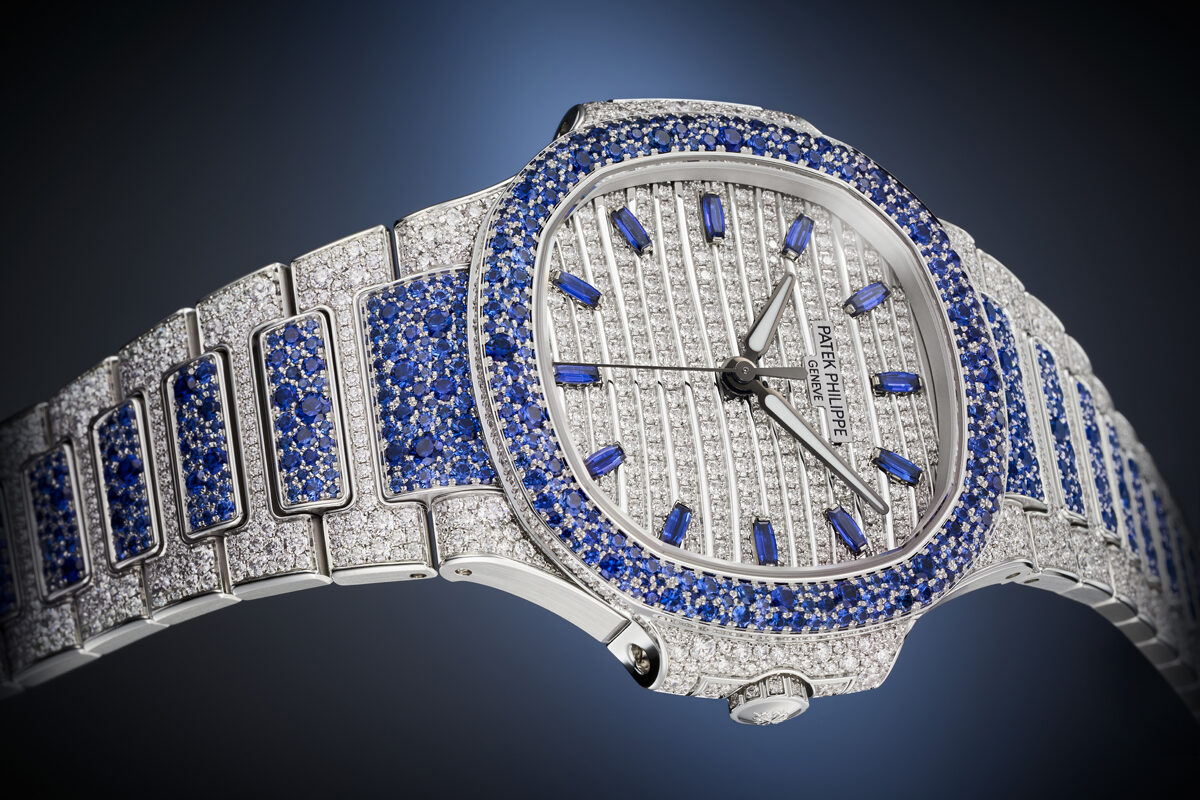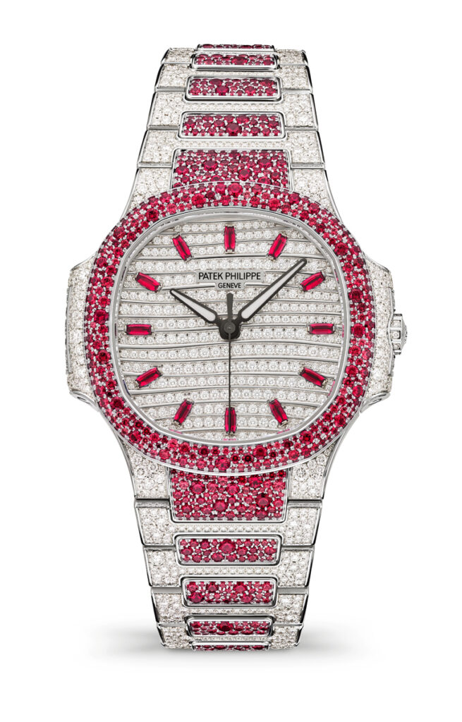 Nautilus Haute Joaillerie References 7118/1451G-001, 7118/1452G-001 and 7118/1453G-001 are three new precious “snow-set” watches combining diamonds with blue sapphires, rubies or emeralds
