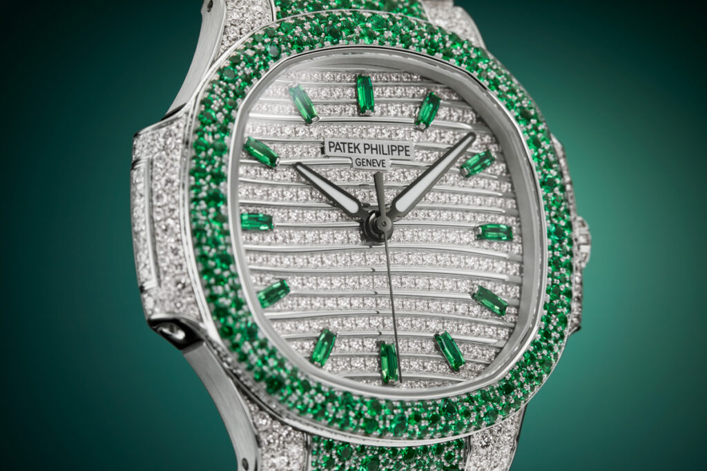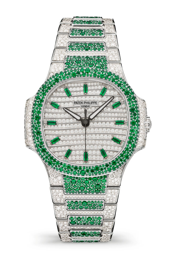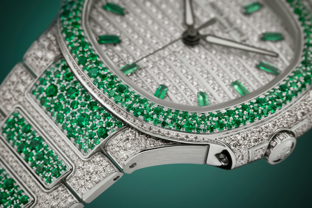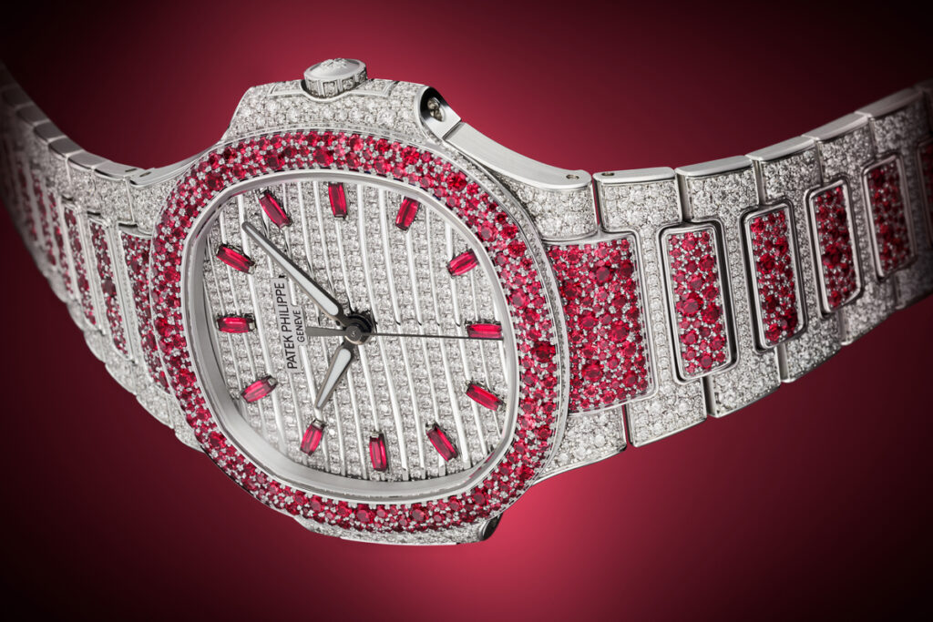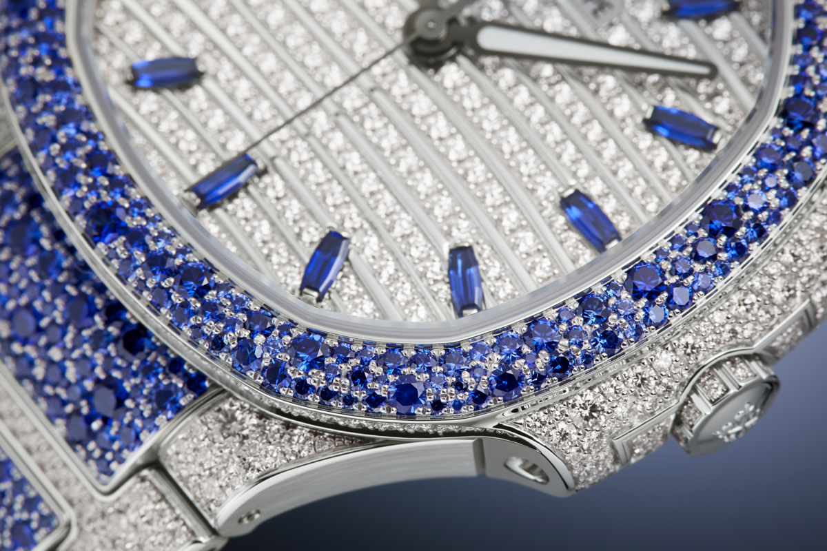 Nautilus Haute Joaillerie References 7118/1451G-001, 7118/1452G-001 and 7118/1453G-001 are three new precious “snow-set” watches combining diamonds with blue sapphires, rubies or emeralds