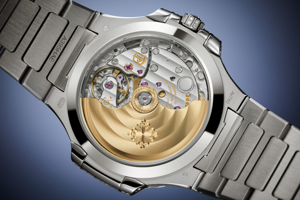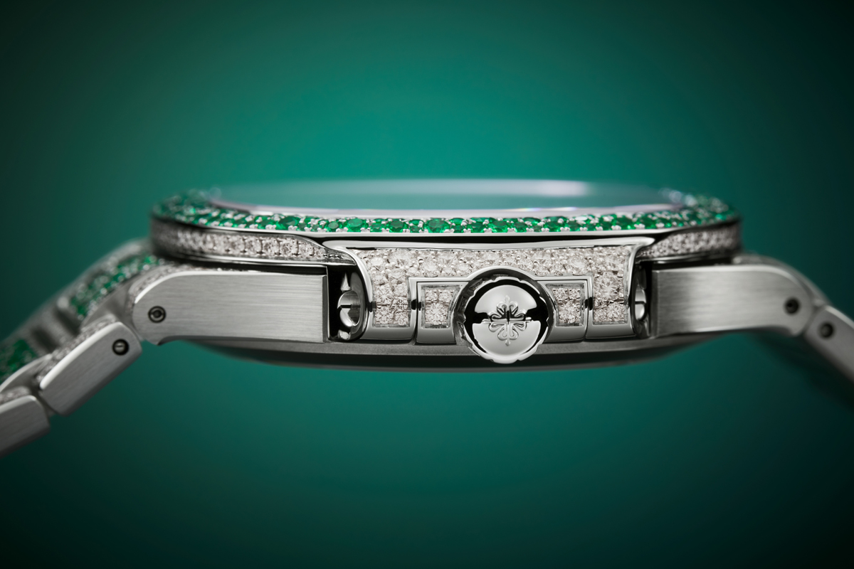 The white-gold dial stands out by its rows of brilliant-cut diamonds set in the pattern of small waves typical of the Ladies’ Nautilus collection. Legibility is ensured by ogival-shaped hour markers in white gold set with 12 blue sapphires, rubies or emeralds; alpha-style hour and minute hands in charcoalgray white gold with a white luminescent coating; and a charcoal-gray sweep-seconds hand.