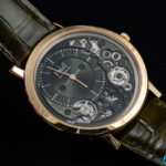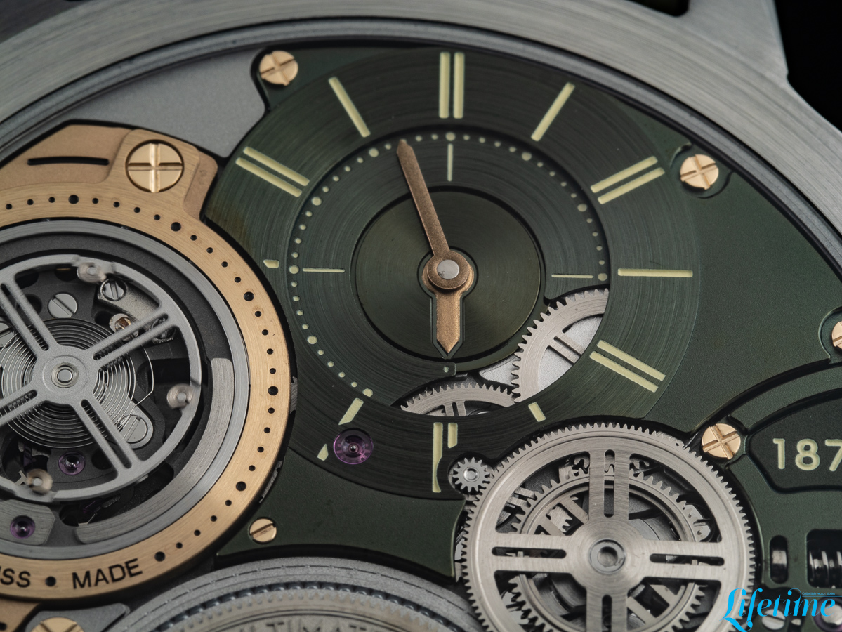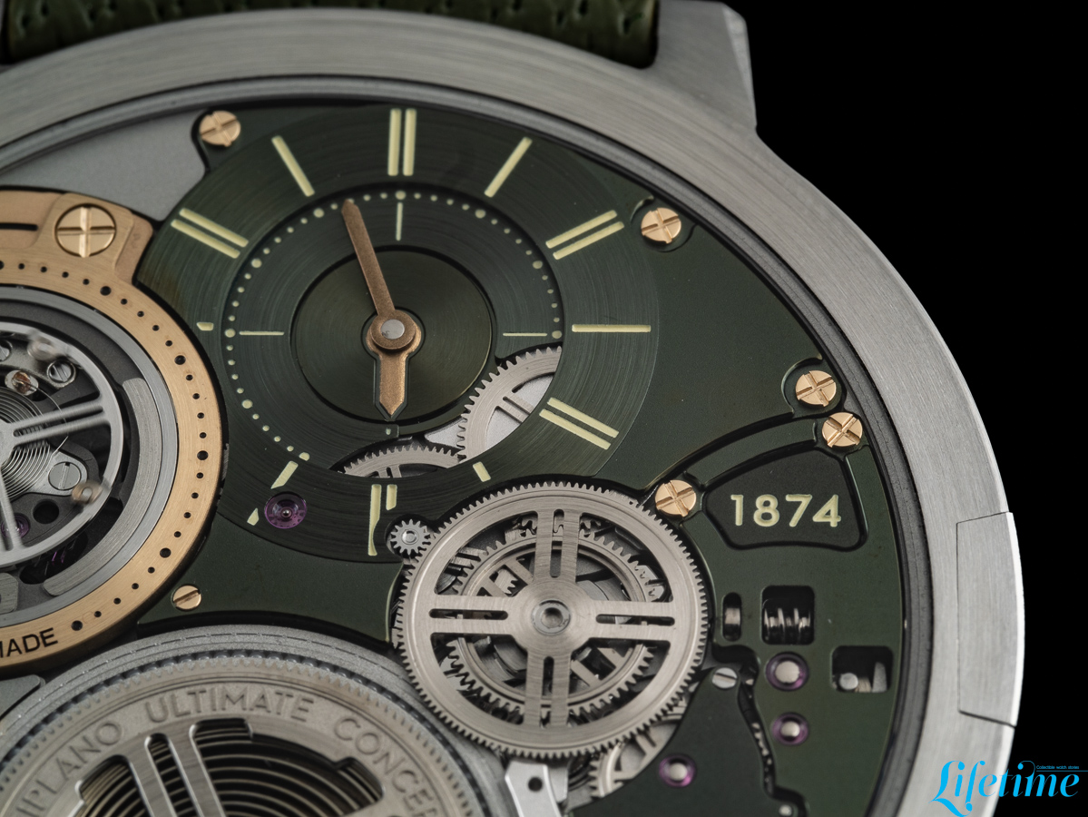 The approach to dial design on both pieces deserves attention, as neither follows convention. On the AUC Tourbillon, there is no dial in the traditional sense: the surface of the movement performs that role directly, with a khaki green coating sweeping across every bridge and plate, punctuated by polished round and bâton indices. A monobloc disc with a dedicated hour hand maintains a clean display, while the one-minute flying tourbillon occupies the 10 o’clock position, visually balanced by the exposed mainspring barrel below.