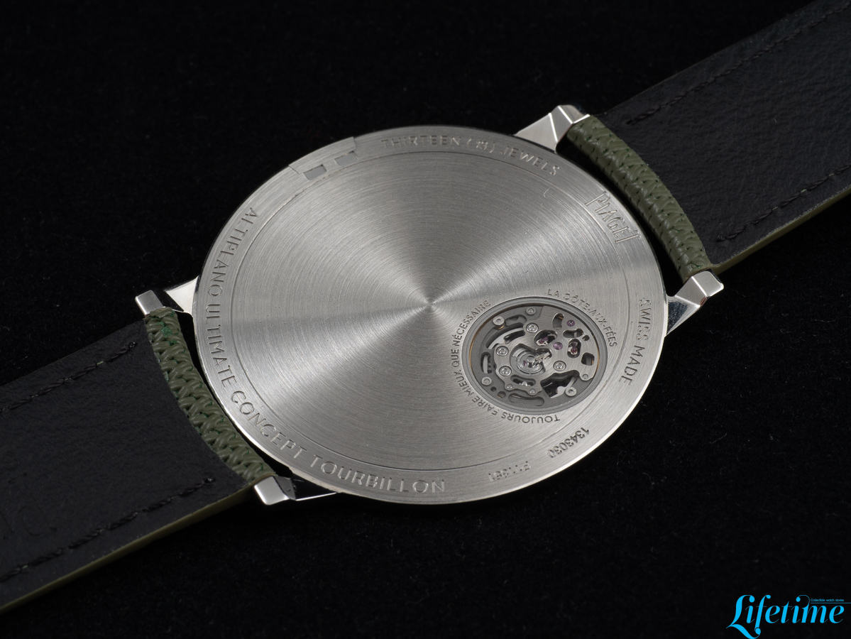 The Calibre 970P-UC powers the AUC Tourbillon, running hand-wound at 4Hz (28,800 vph) with a 35-hour power reserve, 13 jewels, and six ball bearings. What makes this movement extraordinary is its structural integration: the caseback acts as the mainplate, eliminating every redundant layer between the movement and the case. The caseback opens via a 0.16mm-thick sapphire crystal, allowing direct inspection of this integration. The satin-brushed and polished finish on the calibre 970P-UC’s bridges gives it a more refined, contemporary character compared to earlier iterations.
